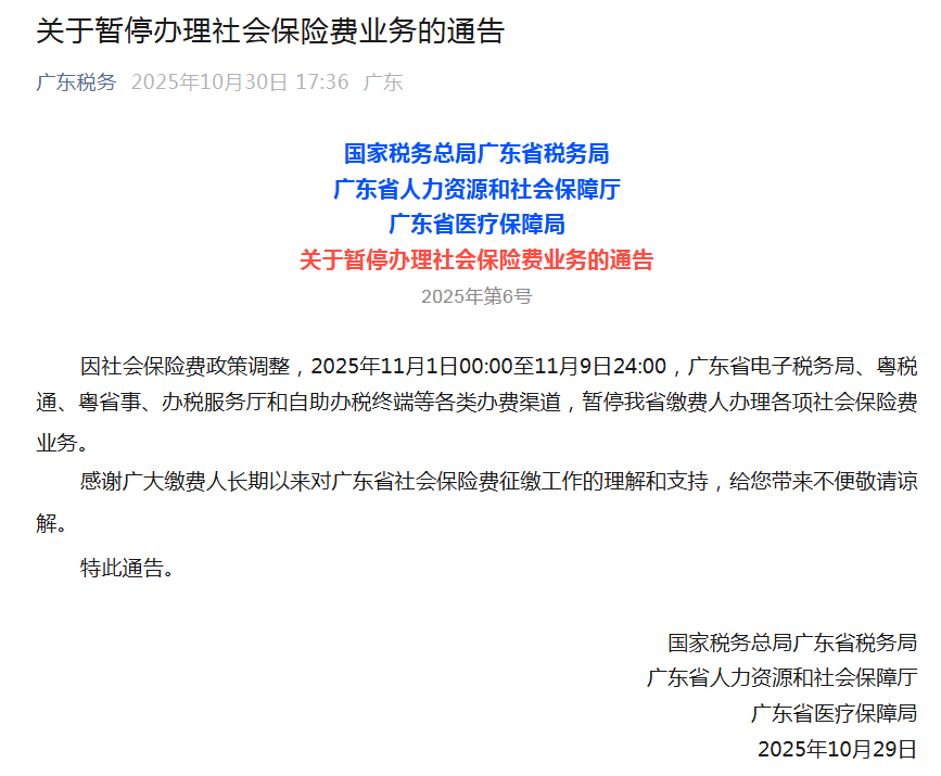 掌上梅州讯 据广东税务消息,因社会保险费政策调整,2025年11月1日00:00至11月9日24:00,广东省电子税务局、粤税通、粤省事、办税服务厅和自助办税终端等各类办费渠道,暂停我省缴费人办理各项社会保险费业务。