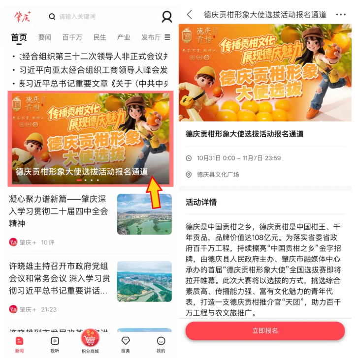 10月31日-11月7日登录“肇庆 + APP”,提交你的个人简介与1分钟自我介绍视频(100MB以下),就能踏上这场“以柑为媒、绽放光芒” 的旅程。