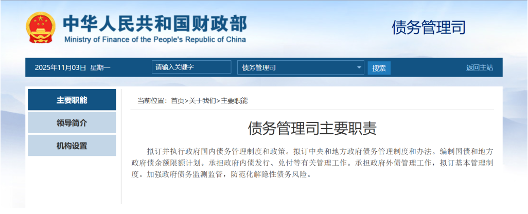 官网介绍,债务管理司主要职责包括:拟订并执行政府国内债务管理制度和政策。拟订中央和地方政府债务管理制度和办法。编制国债和地方政府债余额限额计划。承担政府内债发行、兑付等有关管理工作。承担政府外债管理工作,拟订基本管理制度。加强政府债务监测监管,防范化解隐性债务风险。