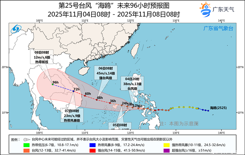 预计,“海鸥”将以20-25公里左右的时速向偏西方向移动,强度变化不大或略有减弱,穿过菲律宾中部后,将于5日早晨移入南海东南部海面,强度将再度加强,最强可达强台风级(14-15级),并将于6日夜间在越南中部一带沿海登陆,之后强度逐渐减弱。过程期间其中心距离广东最近约700公里(距离广州约1000公里),对广东陆地和近海无直接影响。