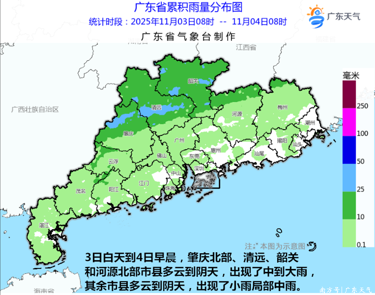 天气实况:3日白天到4日早晨,肇庆北部、清远、韶关和河源北部市县多云到阴天,出现了中到大雨,其余市县多云到阴天,出现了小雨局部中雨。