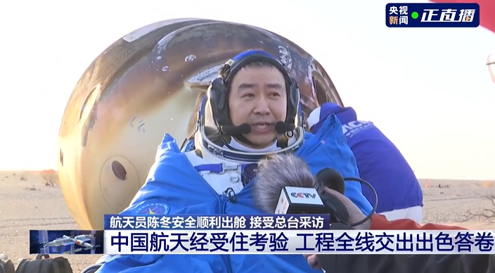 成功着陆!欢迎回家! 2025-11-14 17:42 央视新闻客户端 6 11月14日,神舟二十号航天员乘组,乘坐神舟二十一号载人飞船返回地球。刚刚,神舟二十一号载人飞船返回舱在东风着陆场成功着陆 航天员陈冬、陈中瑞、王杰全部顺利出舱。 编辑:黄炜明 审核:张英昊
