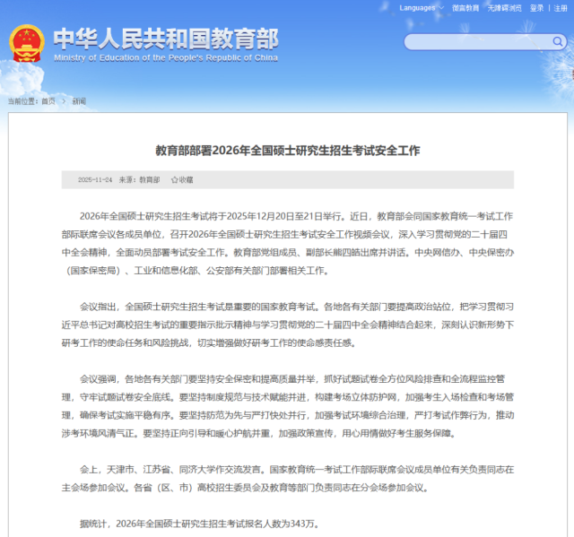 据统计,2026年全国硕士研究生招生考试报名人数为343万。