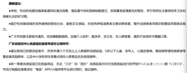 广东省疾控中心传染病预防控制所所长、传染病防控首席专家康敏指出,广东省流感处于流行期,目前主要流行甲型H3N2流感病毒;当前流感活动总体呈上升态势;人员密集的集体单位存在发生暴发疫情风险,5岁以下儿童、老年人、慢性病患者、孕妇等为重症、死亡的高风险人群。