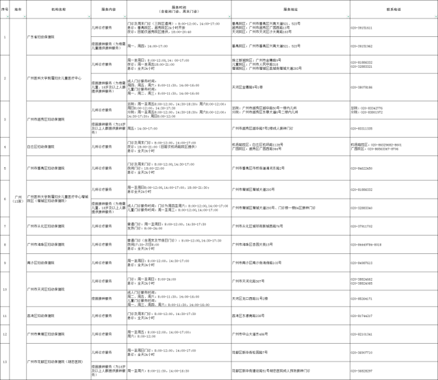 为方便群众接受服务,12月1日,广东省卫生健康委发布全省提供儿科诊疗、疫苗接种服务的妇幼保健机构名单。名单覆盖全省21各地市,共132家妇幼保健机构,列有详细门急诊时间(含夜间门诊、周末门诊)以及地址和联系方式等。