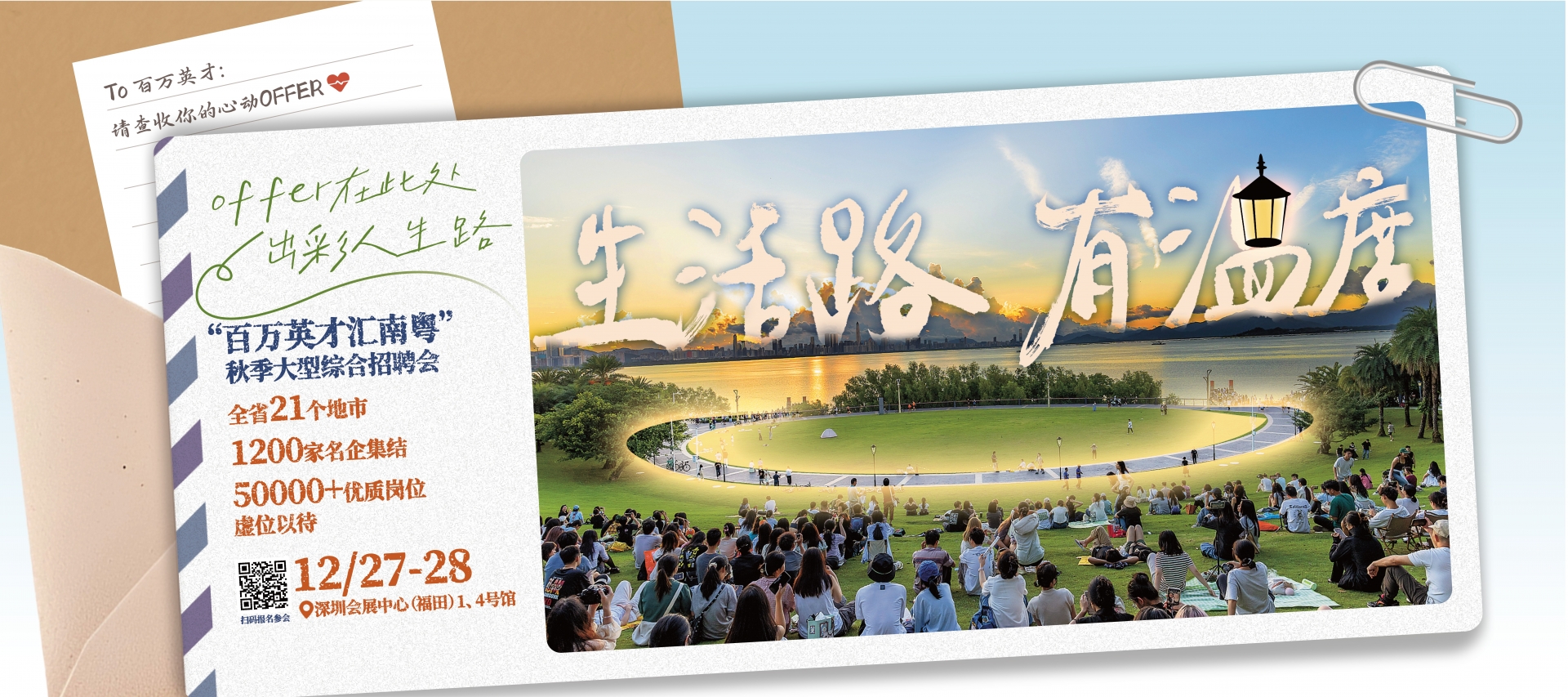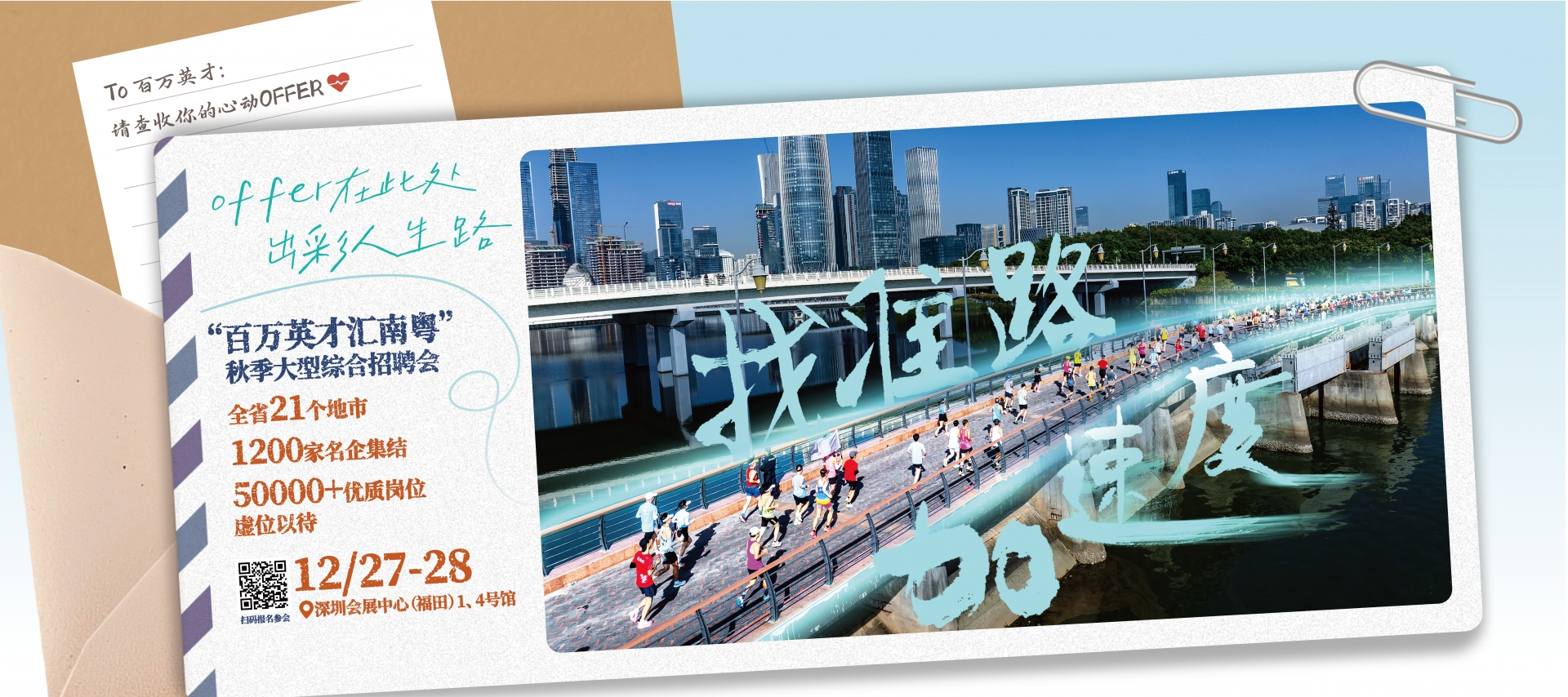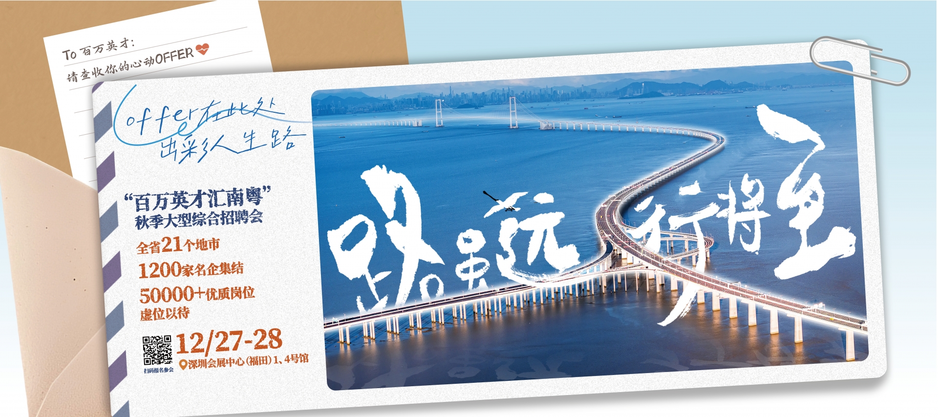 12月27日至28日,由人力资源社会保障部、教育部、广东省委、省政府联合主办,人力资源社会保障部全国人才流动中心、教育部学生服务与素质发展中心、广东省委人才办、省人力资源社会保障厅、省教育厅及深圳市委、市政府共同承办的 “百万英才汇南粤” 秋季大型综合招聘会,将在深圳会展中心(福田)盛大启幕。作为全省年末规模最大、规格最高、资源最集中的招才引智压轴大戏,本次招聘会汇聚粤港澳三地优质资源,超1200家重点用人单位现场揽才,提供超5万个优质岗位,其中众多岗位年薪达50万元以上,向海内外英才发出“双向奔赴”的最强邀约。