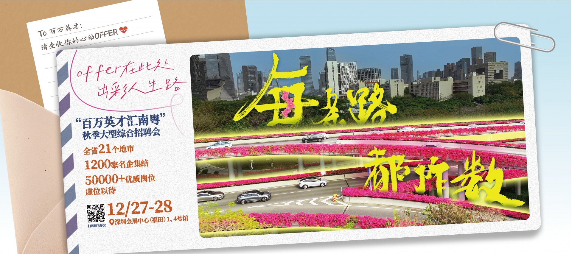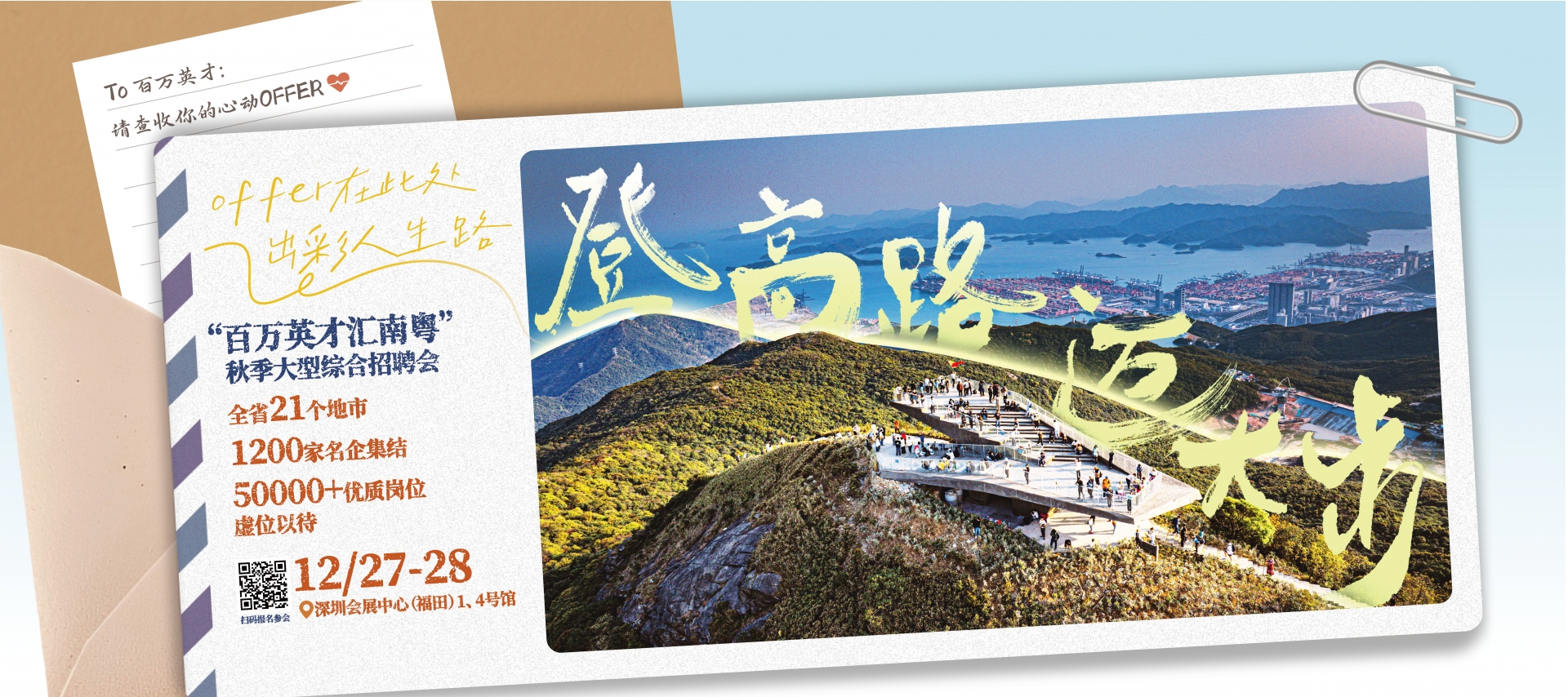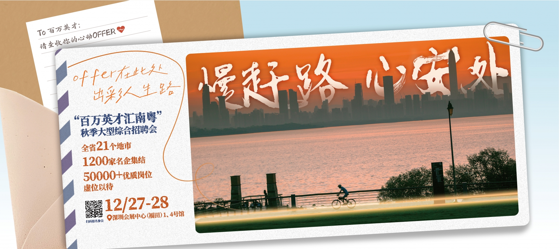 12月27日至28日,由人力资源社会保障部、教育部、广东省委、省政府联合主办,人力资源社会保障部全国人才流动中心、教育部学生服务与素质发展中心、广东省委人才办、省人力资源社会保障厅、省教育厅及深圳市委、市政府共同承办的 “百万英才汇南粤” 秋季大型综合招聘会,将在深圳会展中心(福田)盛大启幕。作为全省年末规模最大、规格最高、资源最集中的招才引智压轴大戏,本次招聘会汇聚粤港澳三地优质资源,超1200家重点用人单位现场揽才,提供超5万个优质岗位,其中众多岗位年薪达50万元以上,向海内外英才发出“双向奔赴”的最强邀约。