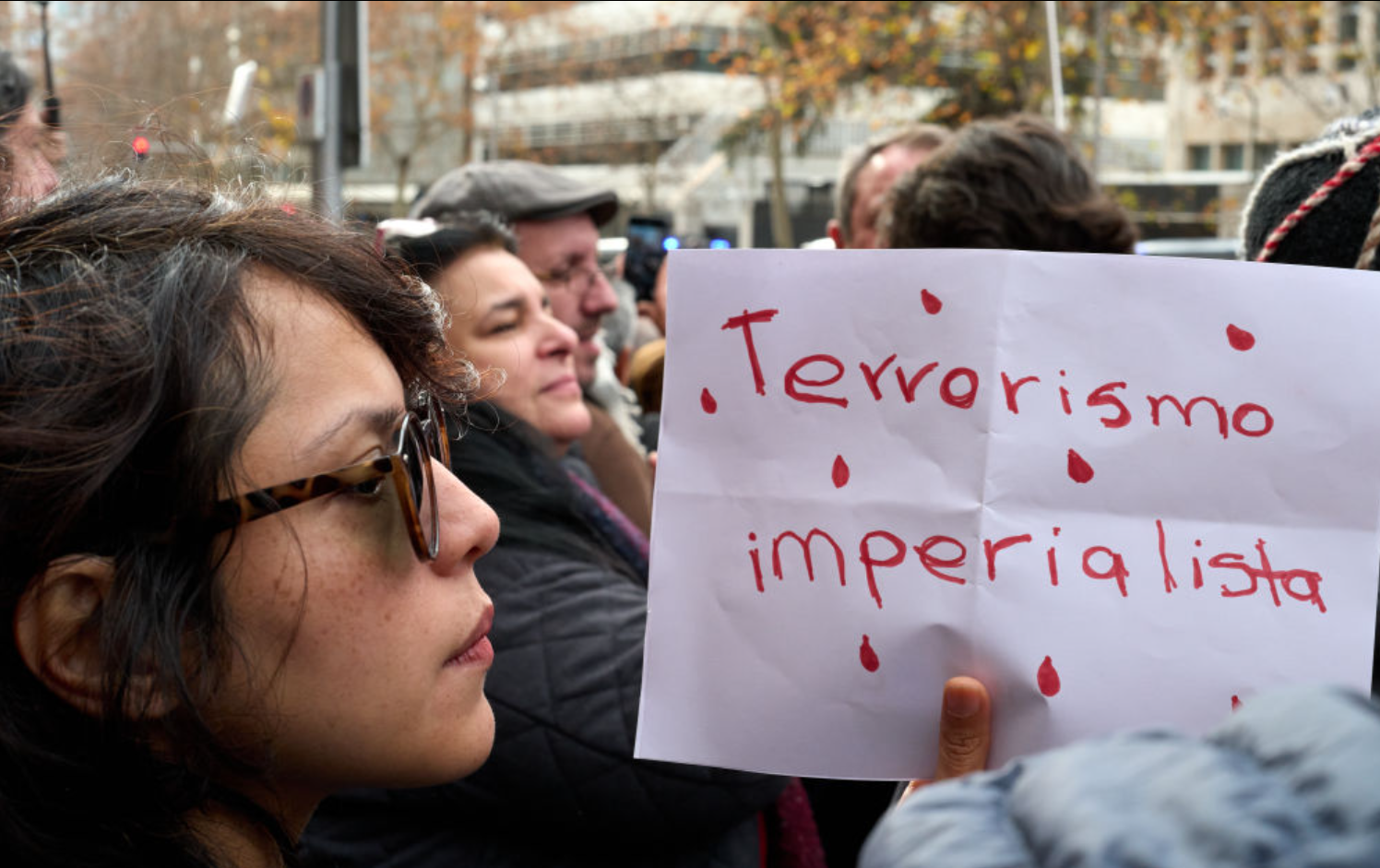1月4日,一名女子在西班牙马德里市中心的美国驻西班牙大使馆前参加抗议活动,谴责美军突袭委内瑞拉。新华社记者孟鼎博摄