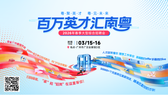 在“十四五”圆满收官、“十五五”扬帆起步的关键之年,“百万英才汇南粤”2026年春季大型综合招聘会将以更全面的岗位资源、更精准的对接服务、更广阔的展示平台在广州琶洲重磅“登场”!吹响新一年人才集聚冲锋号,诚挚邀请全球英才汇聚湾区、共创未来!