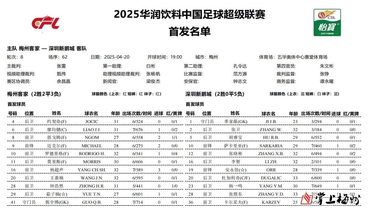 掌上梅州讯 4月20日晚,2025赛季中超联赛第8轮上演广东德比,梅州客家坐镇主场五华县惠堂体育场迎战同省球队深圳新鹏城。