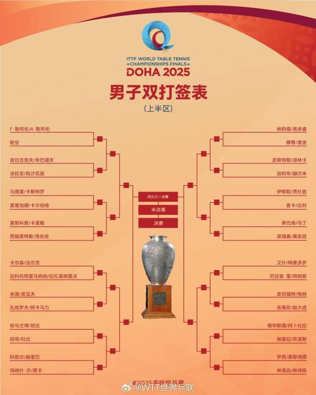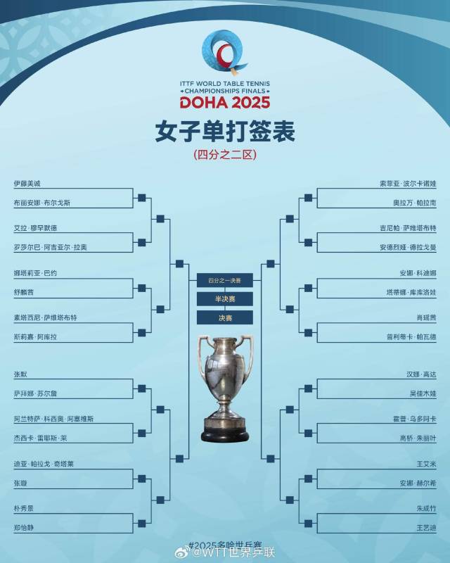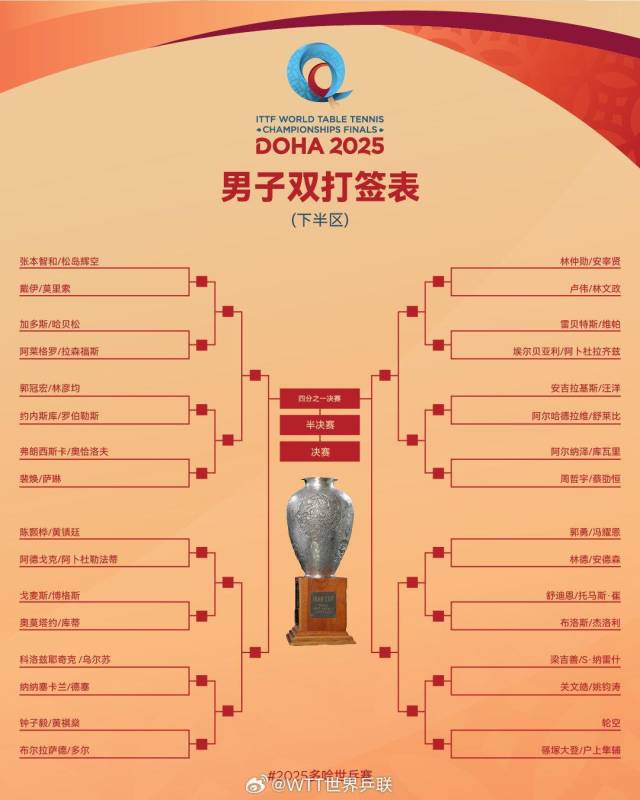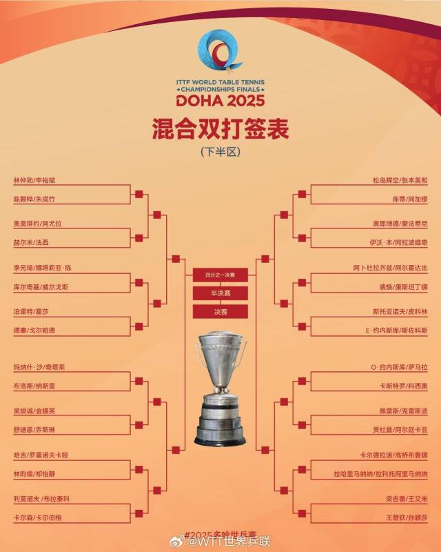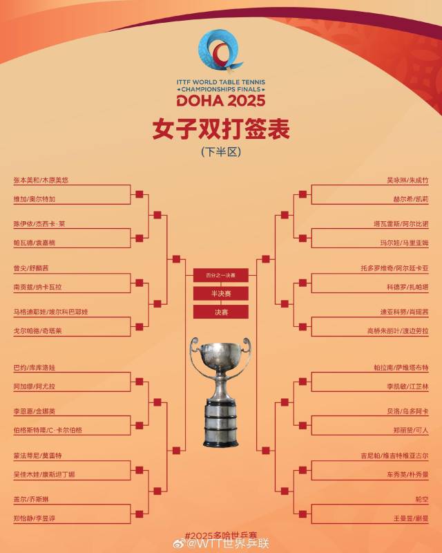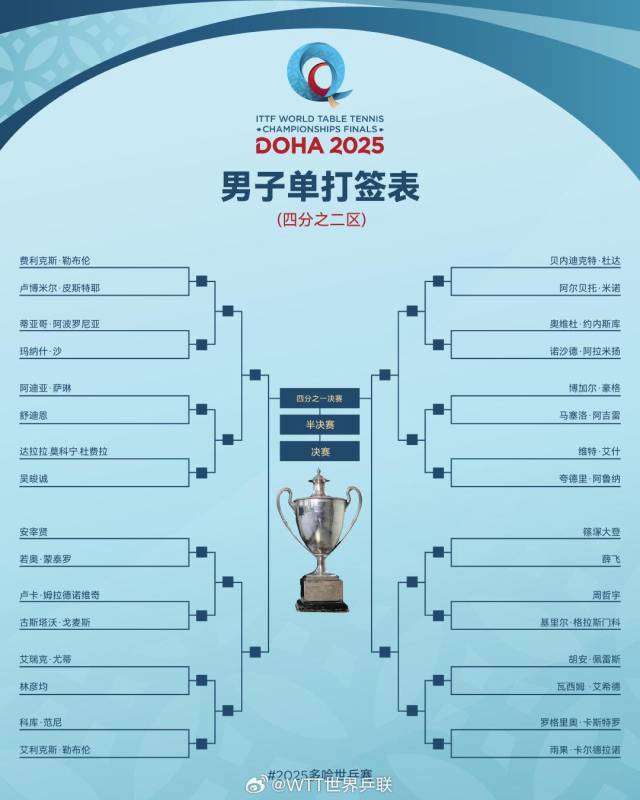多哈世乒赛签表出炉,一起为国乒加油! 2025-05-01 10:29 WTT世界乒联 0 2025年多哈世界乒乓球锦标赛决赛将于5月17日至25日在卡塔尔多哈举办。男子单打、女子单打等签表出炉↓↓ 男子单打签表⬇️ 女子单打签表⬇️ 男子双打签表⬇️ 女子双打签表⬇️ 混合双打签表⬇️ 编辑:张晓珊 审核:张英昊