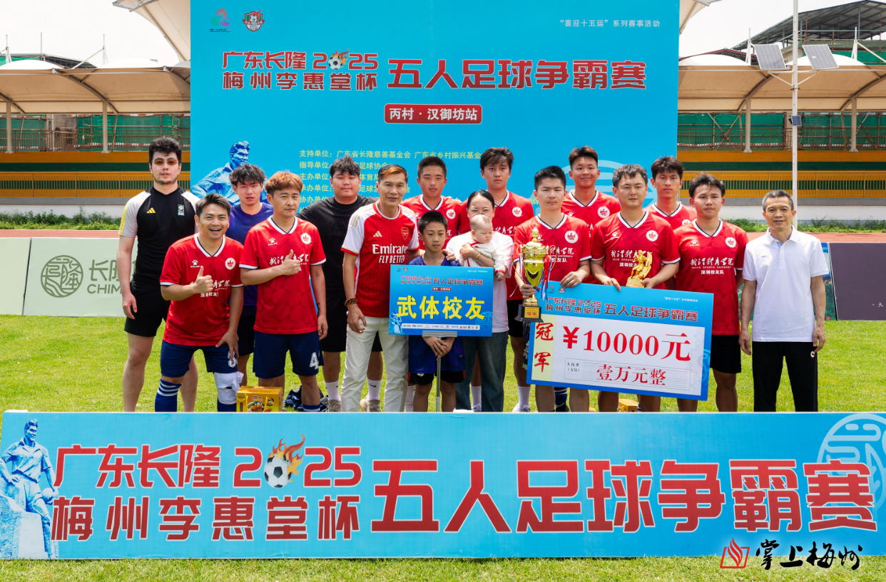 掌上梅州讯 5月3日上午,广东长隆2025梅州李惠堂杯五人足球争霸赛丙村·汉御坊站在丙村镇长隆足球公园落下帷幕。全国邀请赛决赛中,武汉体育学院校友队以3∶0战胜梅县丙村队,夺得全国邀请赛冠军;在2日晚举行的社会组决赛中,辉业机电以4∶0战胜法誉信,夺得社会组冠军。