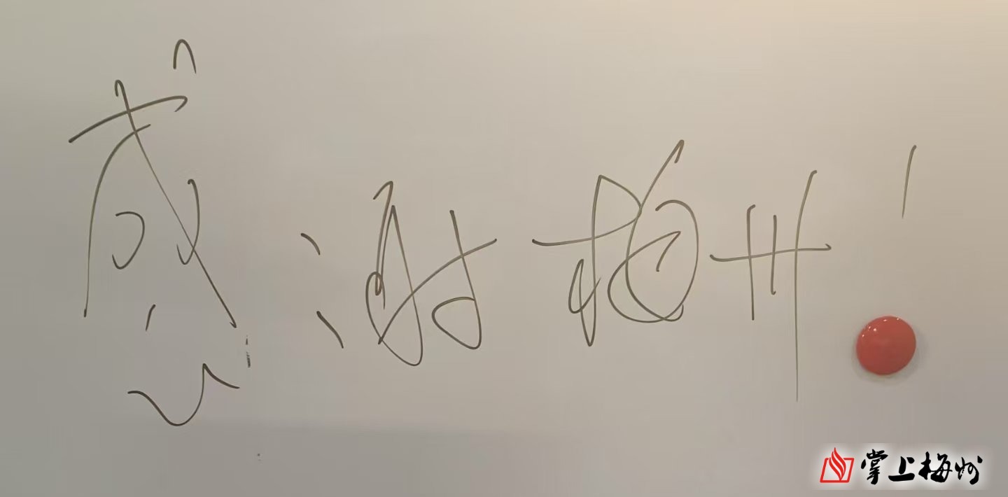 掌上梅州讯 6月17日,文体中心的志愿者们在上海队球员的休息室发现了一个小惊喜——在休息室内的白板上,写着“感谢梅州”四个字,末尾的感叹号还点缀着红色的磁扣。