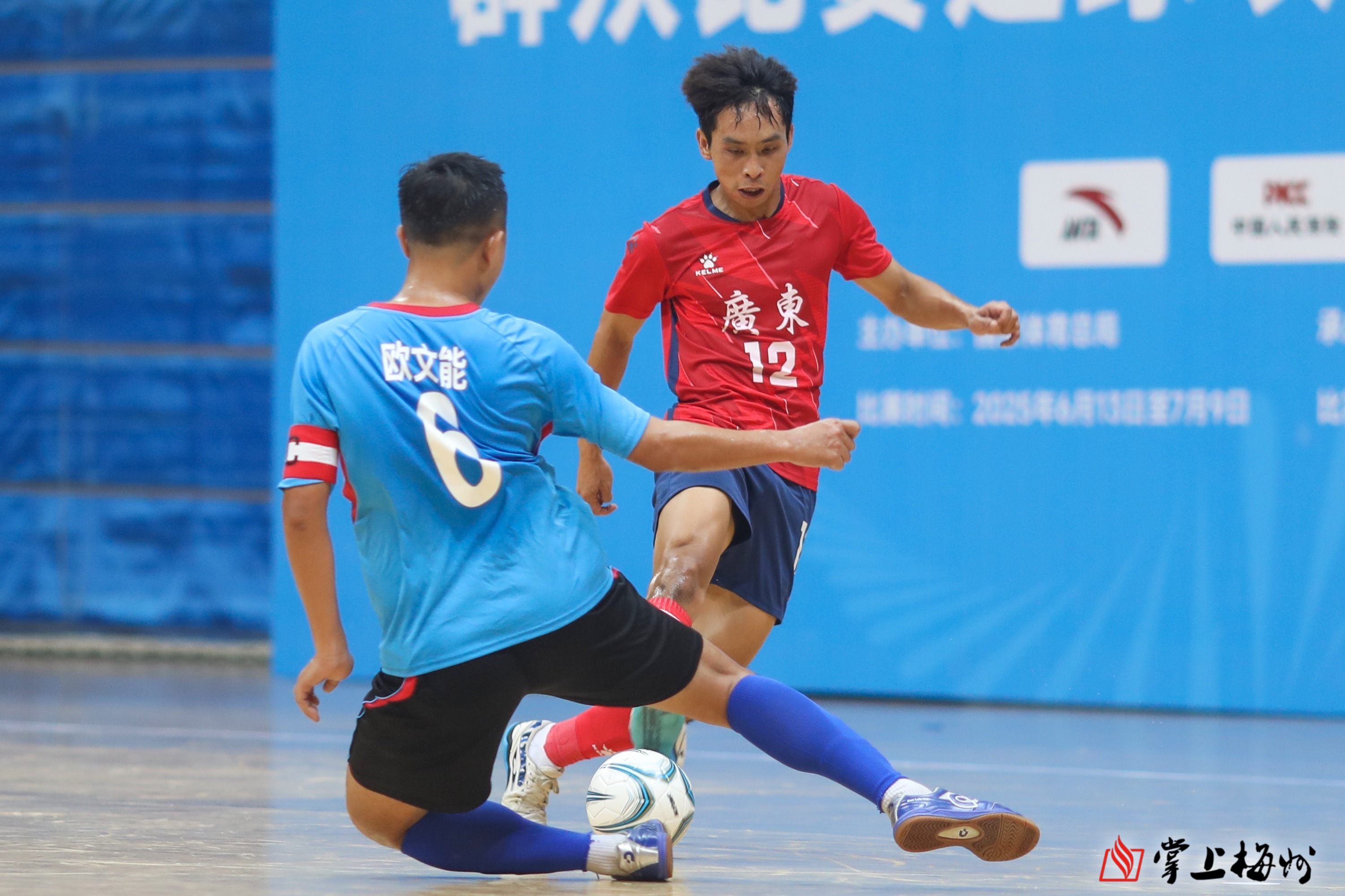 掌上梅州讯 6月27日,第十五届全国运动会群众比赛足球项目五人制男子乙组进行第一轮排位赛共4场比赛。广东队7:1战胜海南队晋级四强。香港队则在常规时间1:1打平新疆队,在点球大战中以3:5遗憾落败。