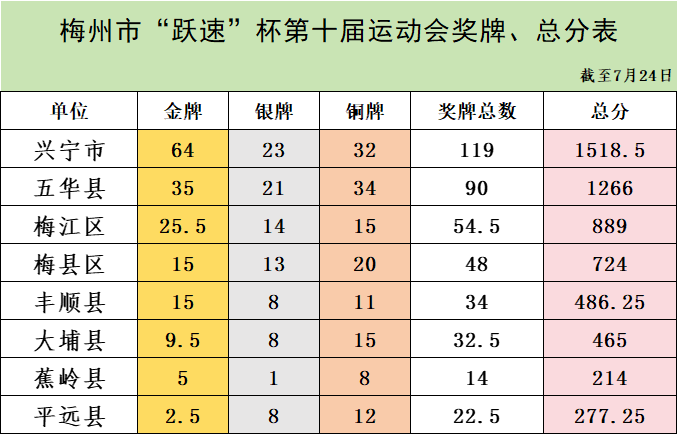 梅州市第十届运动会奖牌、总分表(截至7月24日)