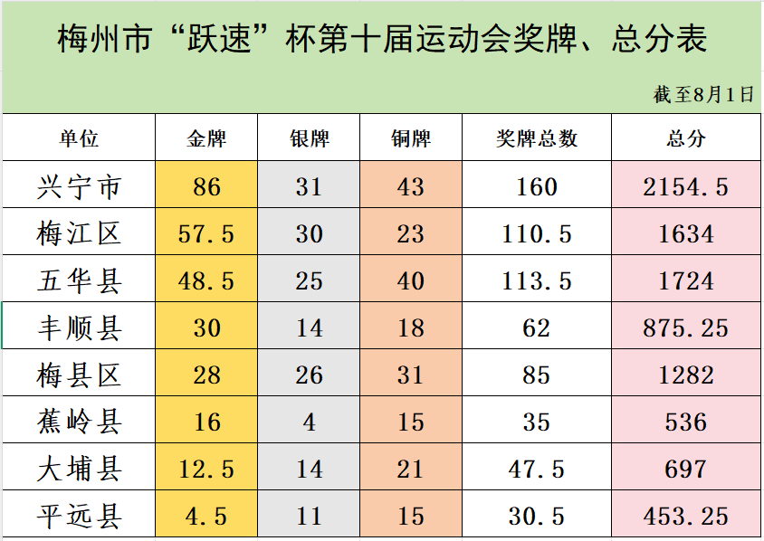 梅州市第十届运动会奖牌、总分表(截至8月1日)