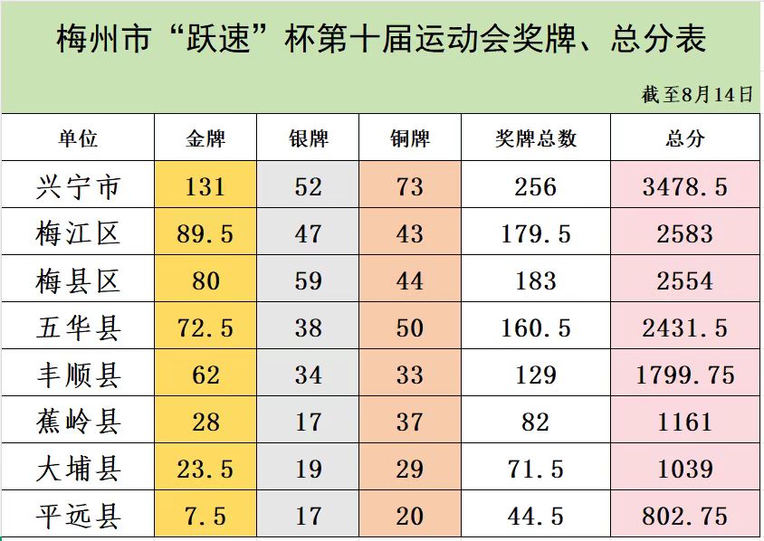 梅州市第十届运动会奖牌、总分表(截至8月14日)