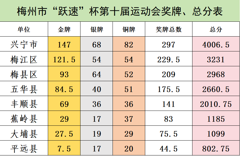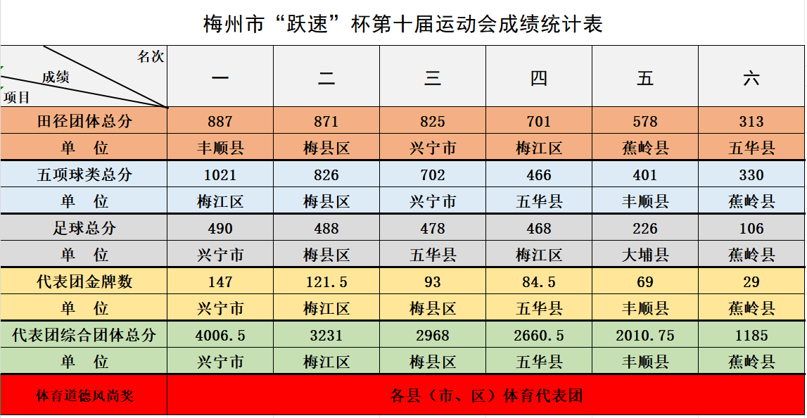 据了解,本届运动会于7月13日至8月20日在兴宁主赛区和梅县、五华、丰顺、市体校、市游泳协会、市网球协会等六个分赛区顺利举行。共设置17个大项、322个小项比赛,设560枚金牌,共有3664名运动员驰骋赛场。经过40多天的激烈角逐,共有30人次、2队破17项梅州市少年纪录。赛事期间,市县两级各相关部门有序协作,选派裁判员433人,工作人员约700人,志愿者1000人次,狠抓赛风赛纪和安全办赛,严格执行比赛方案和规程,达到了将本届市运会办成一届“简约、安全、精彩”的体育盛会、为十五运会做好预演预热的预期目标。