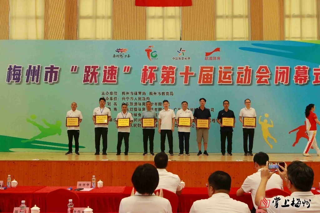 闭幕式上进行了梅州市第十届运动会情况通报,宣布了梅州市第十届运动会各代表团成绩。随后进行颁奖仪式,梅江、梅县、兴宁、平远、蕉岭、大埔、丰顺、五华八个体育代表团获市第十届运动会体育道德风尚奖;丰顺、梅县、兴宁获得田径团体总分前三名;梅江、梅县、兴宁获得五项球类总分前三名;兴宁、梅县、五华获得足球总分前三名;兴宁、梅江、梅县获得代表团金牌数和代表团综合团体总分前三名。闭幕式现场还为总冠名单位、捐款十万元以上的赞助企业颁发了牌匾。最后举行了梅州市运动会会旗交接仪式,梅州市第十一届运动会承办地平远县接过会旗,标志着梅州市运动会的承办权正式移交。