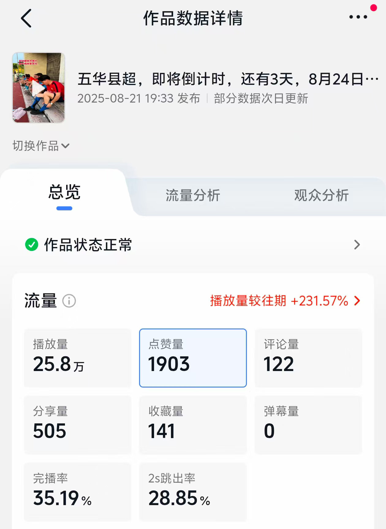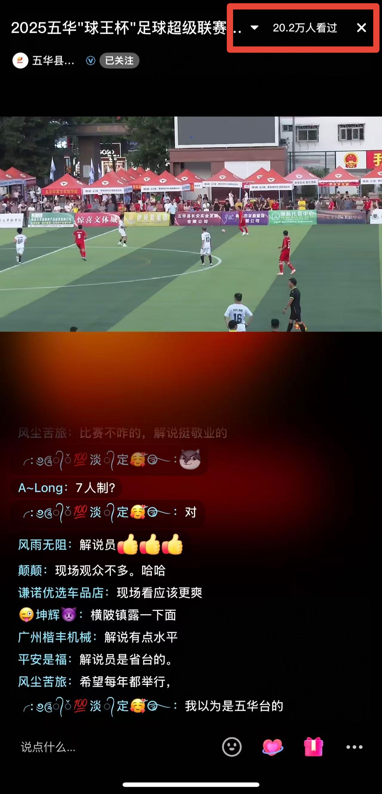 据初步统计,8月23日开幕式至24日第一轮小组赛结束,网络直播曝光量累计达60.1万人次。而“客家茶哥”“张搞长”团队,自发起创作短视频宣传县超以来,视频总浏览数达到了200万人次,点赞量超20万,24日下午梅林主场对阵周江队期间,梅林主场观战6000人,占常住人口的20%,还带动土特产线上线下销售达5.46万元。