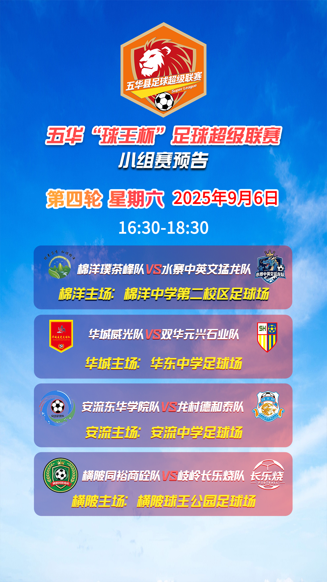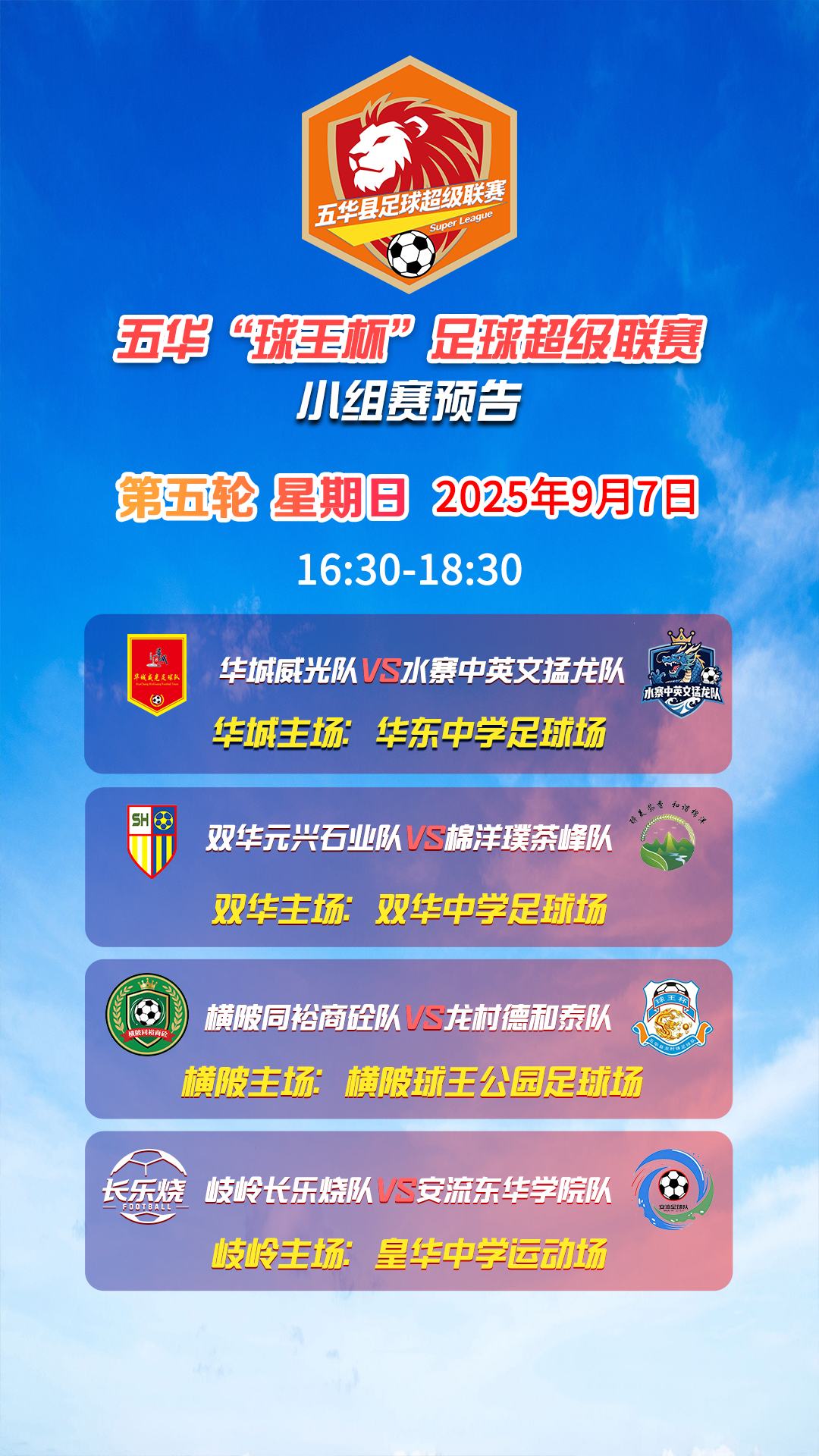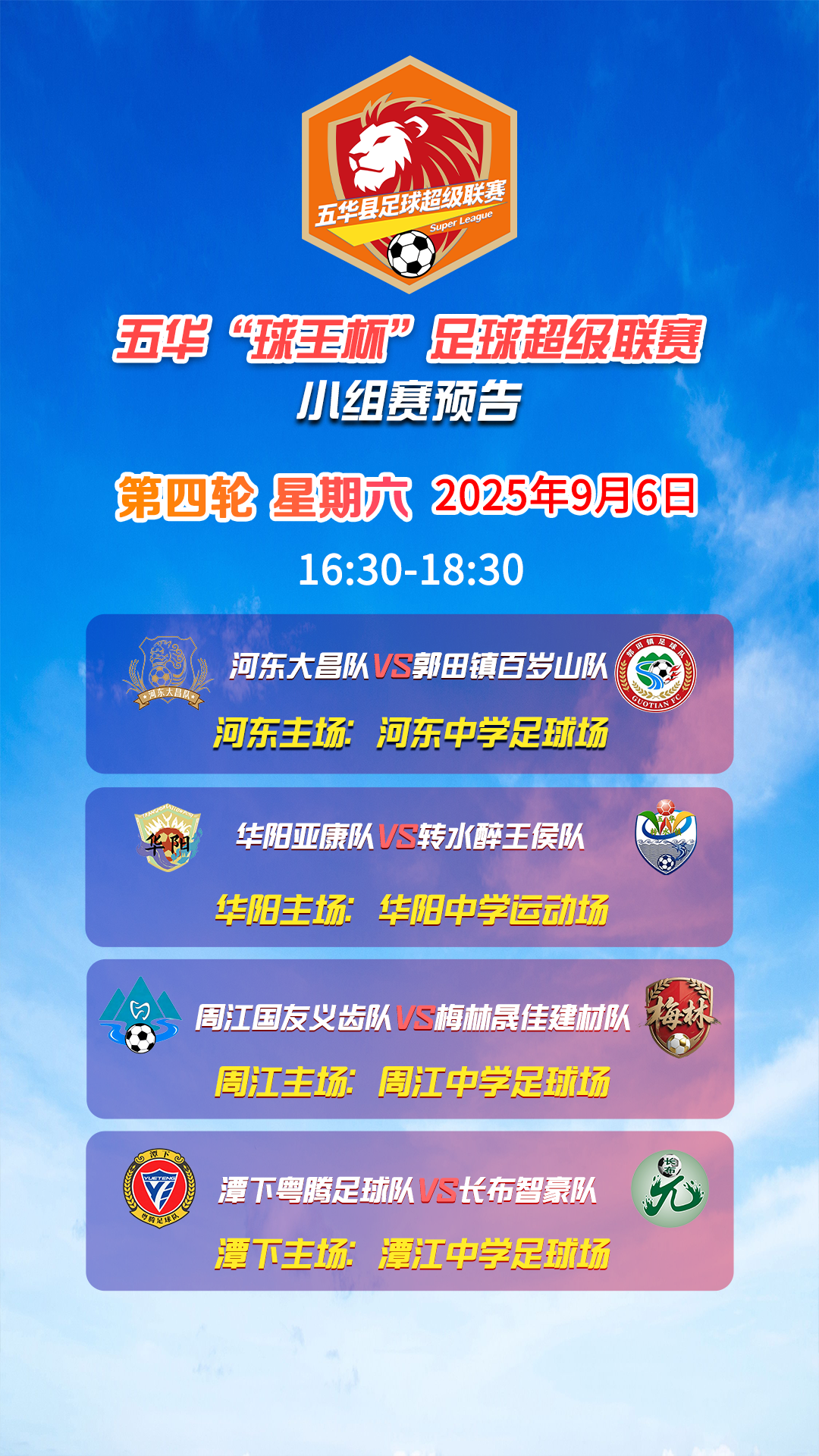 这个周末,五华“县超”六轮小组赛将完赛五轮,结合目前各组头尾差距较大的情况,可以预见本周末将基本决定各组出线形势(各组前两名出线)。让我们再次相约赛场,一起为喜爱的球队加油助威,共同见证五华足球的魅力时刻!
