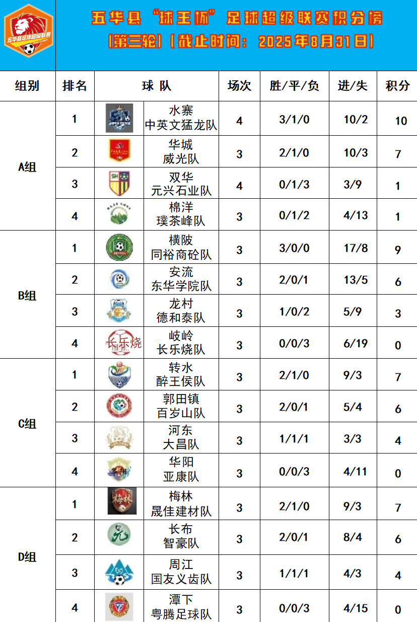A组中,水寨队目前以3胜1平积10分领跑A组,进攻火力强劲(进10球);华城队2胜1平积7分暂列A组第二,双华、棉洋各积1分,面临很大的出线压力,周末急需抢分。