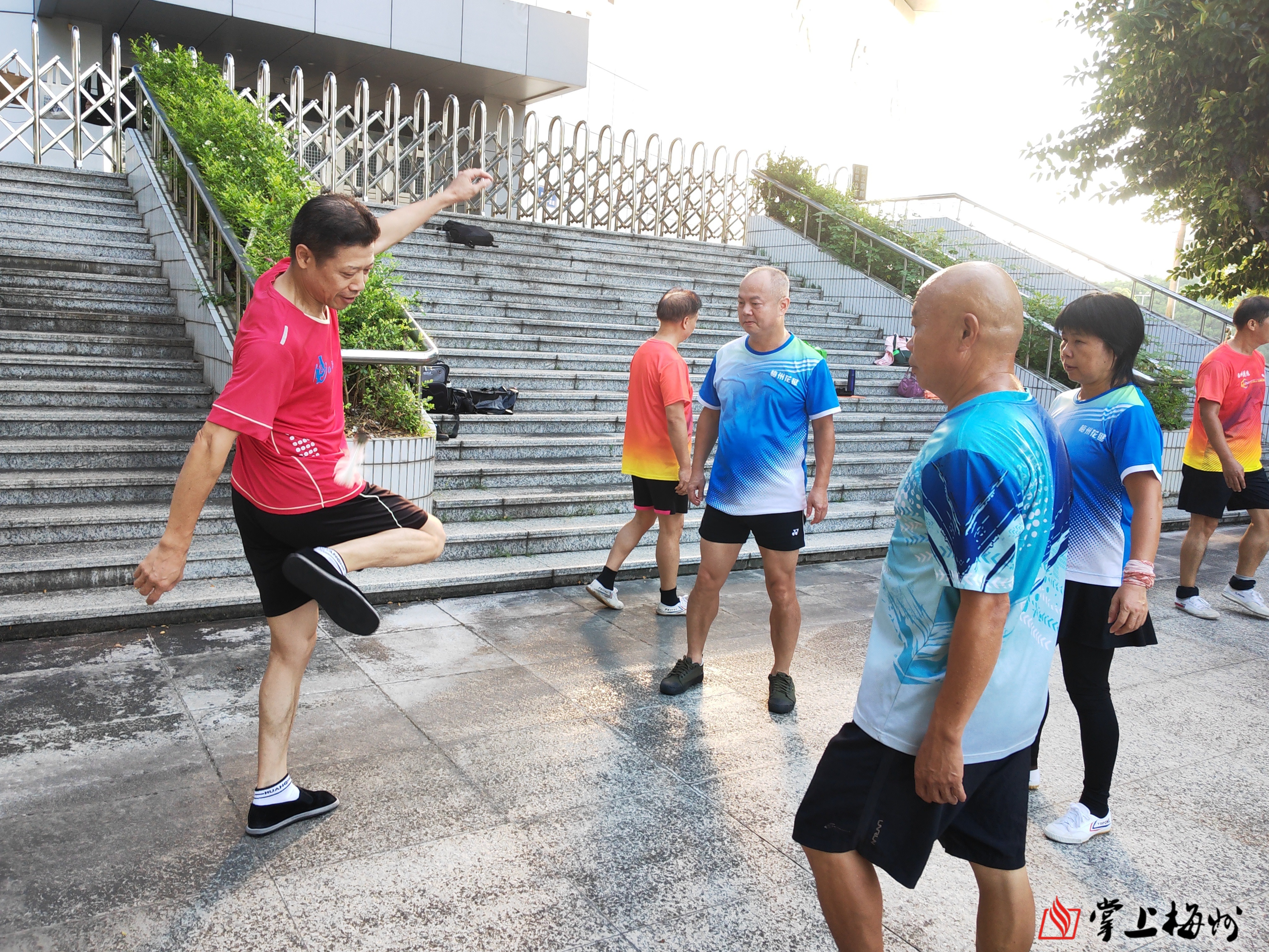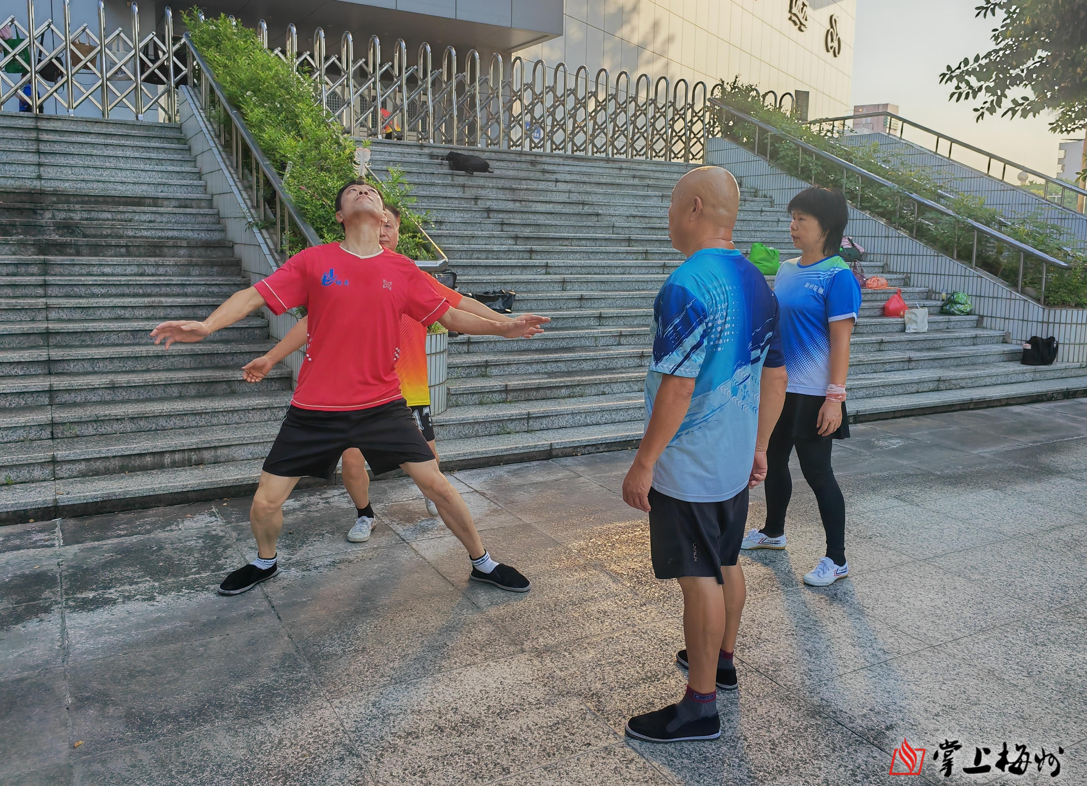 侯经智(左一)在展示南派花毽的花式踢法。