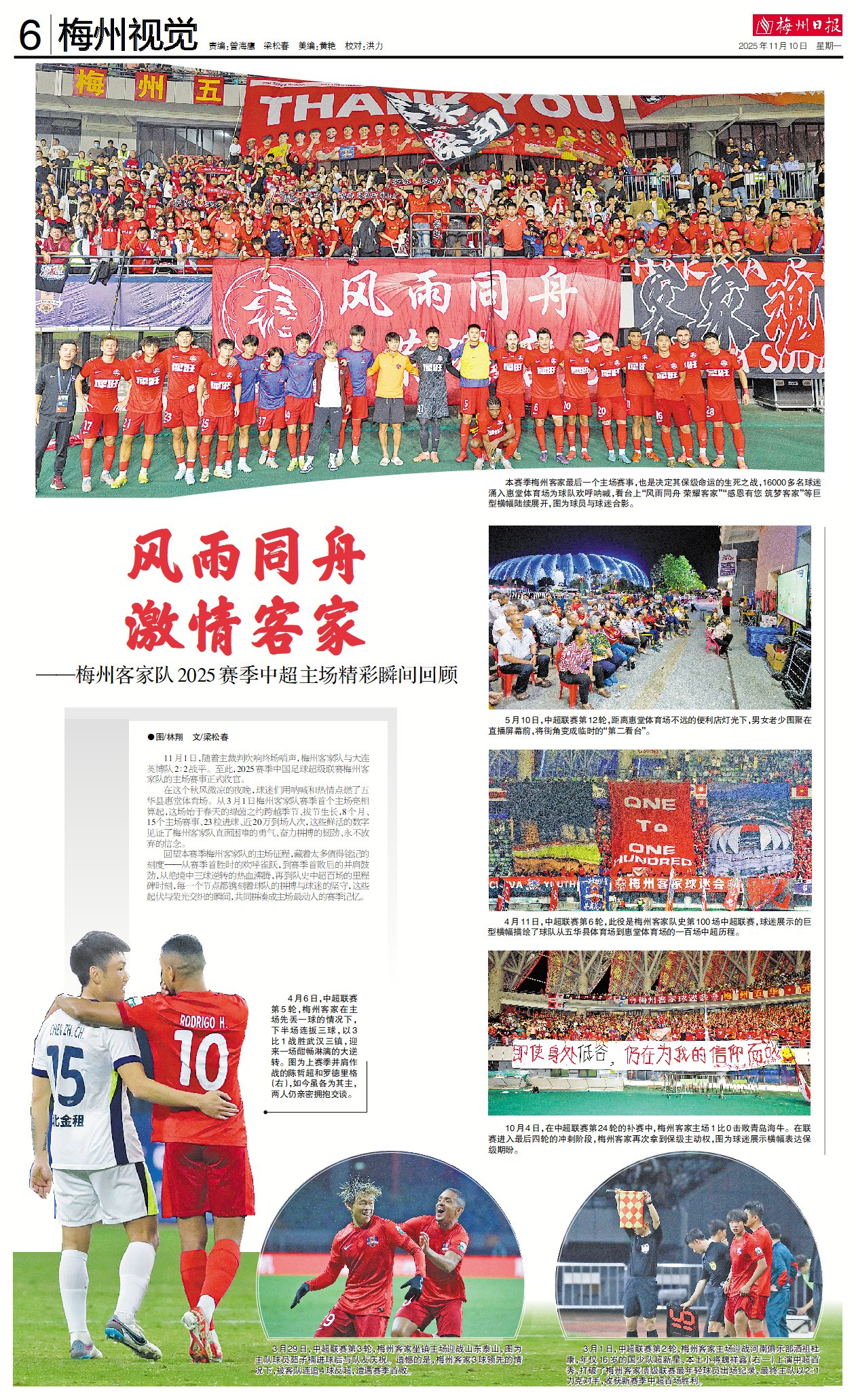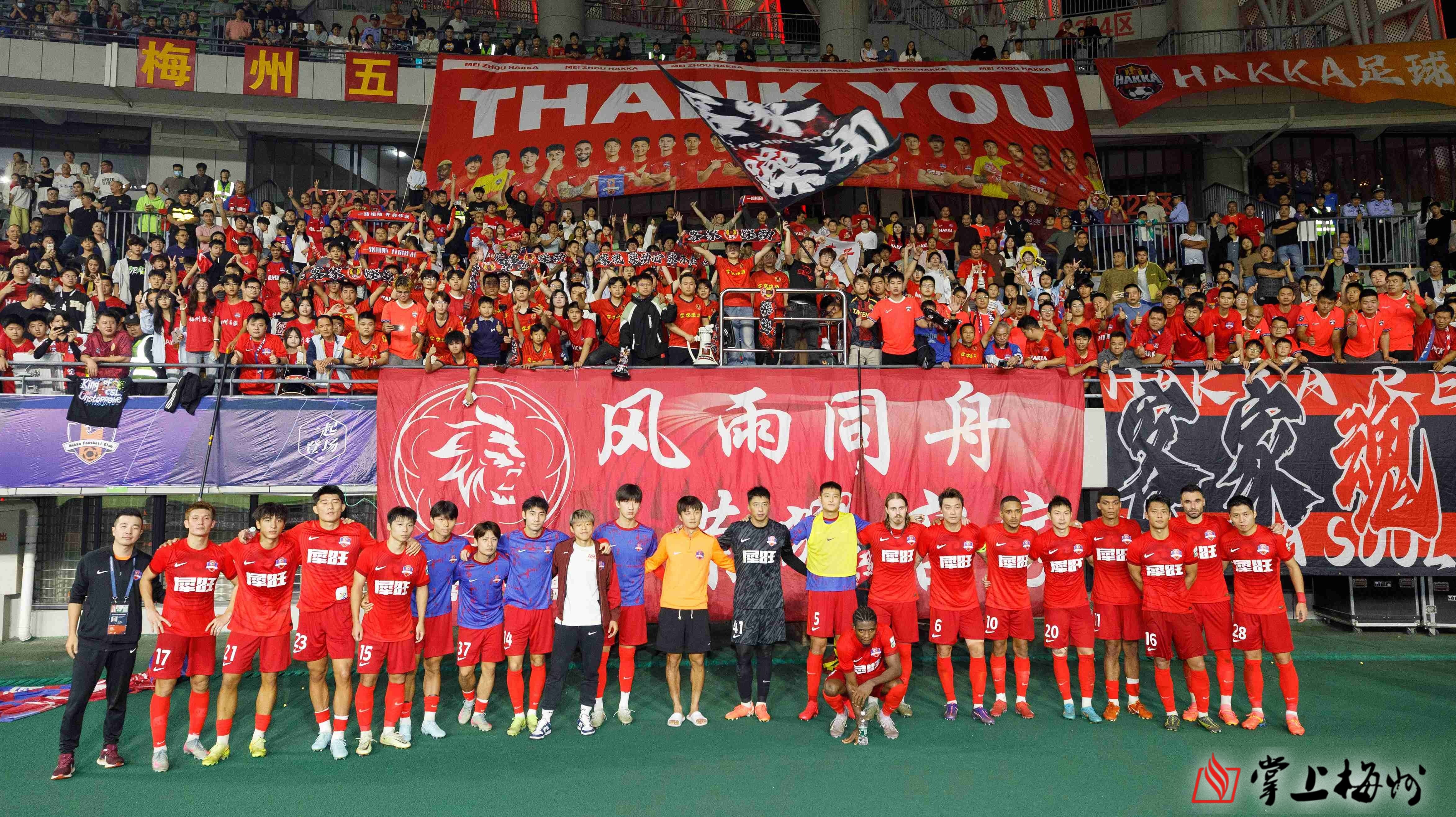 本赛季梅州客家最后一个主场赛事,也是决定其保级命运的生死之战,16000多名球迷涌入惠堂体育场为球队欢呼呐喊,看台上“风雨同舟 荣耀客家”“感恩有您 筑梦客家”等巨型横幅陆续展开,图为球员与球迷合影。