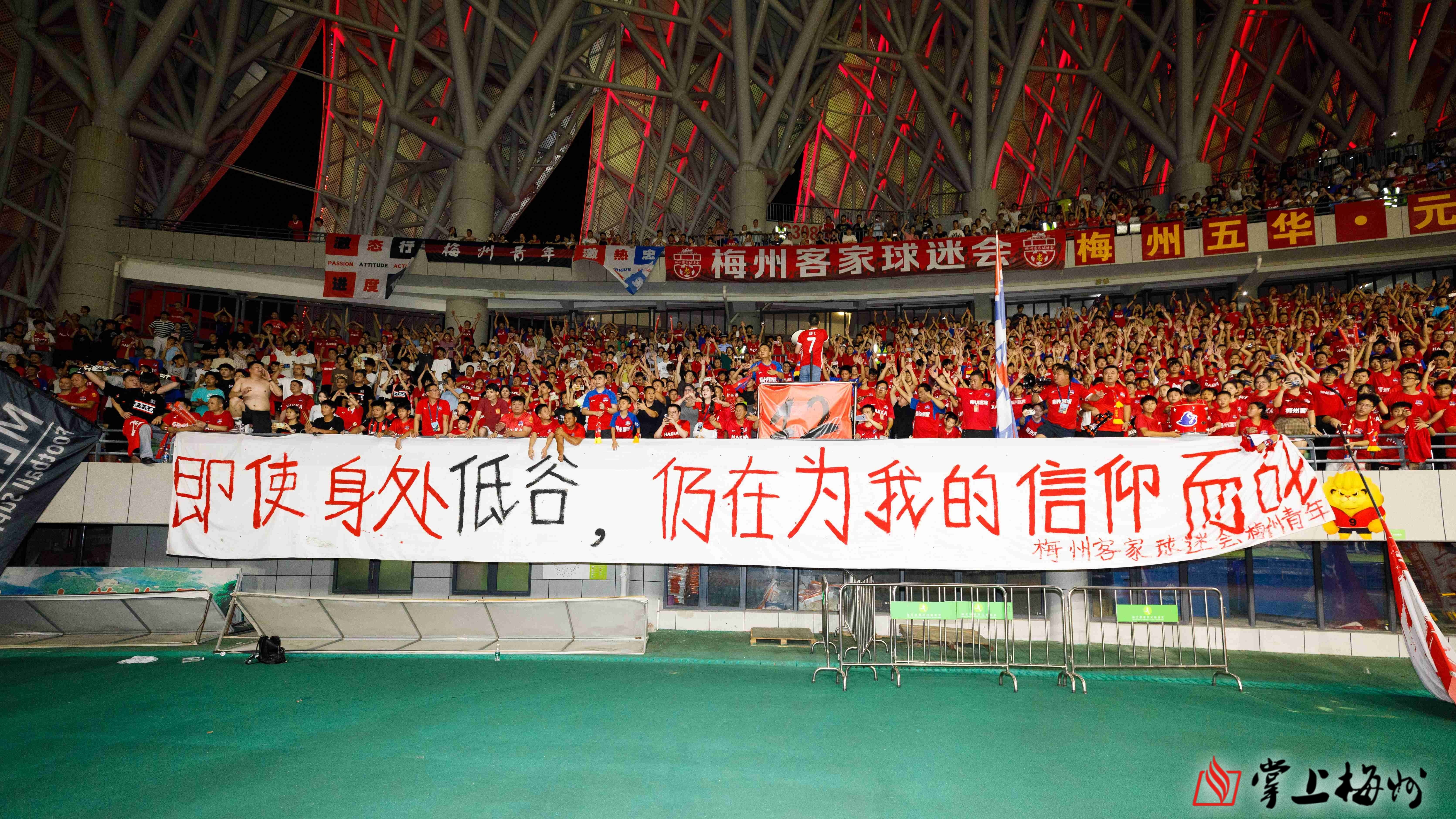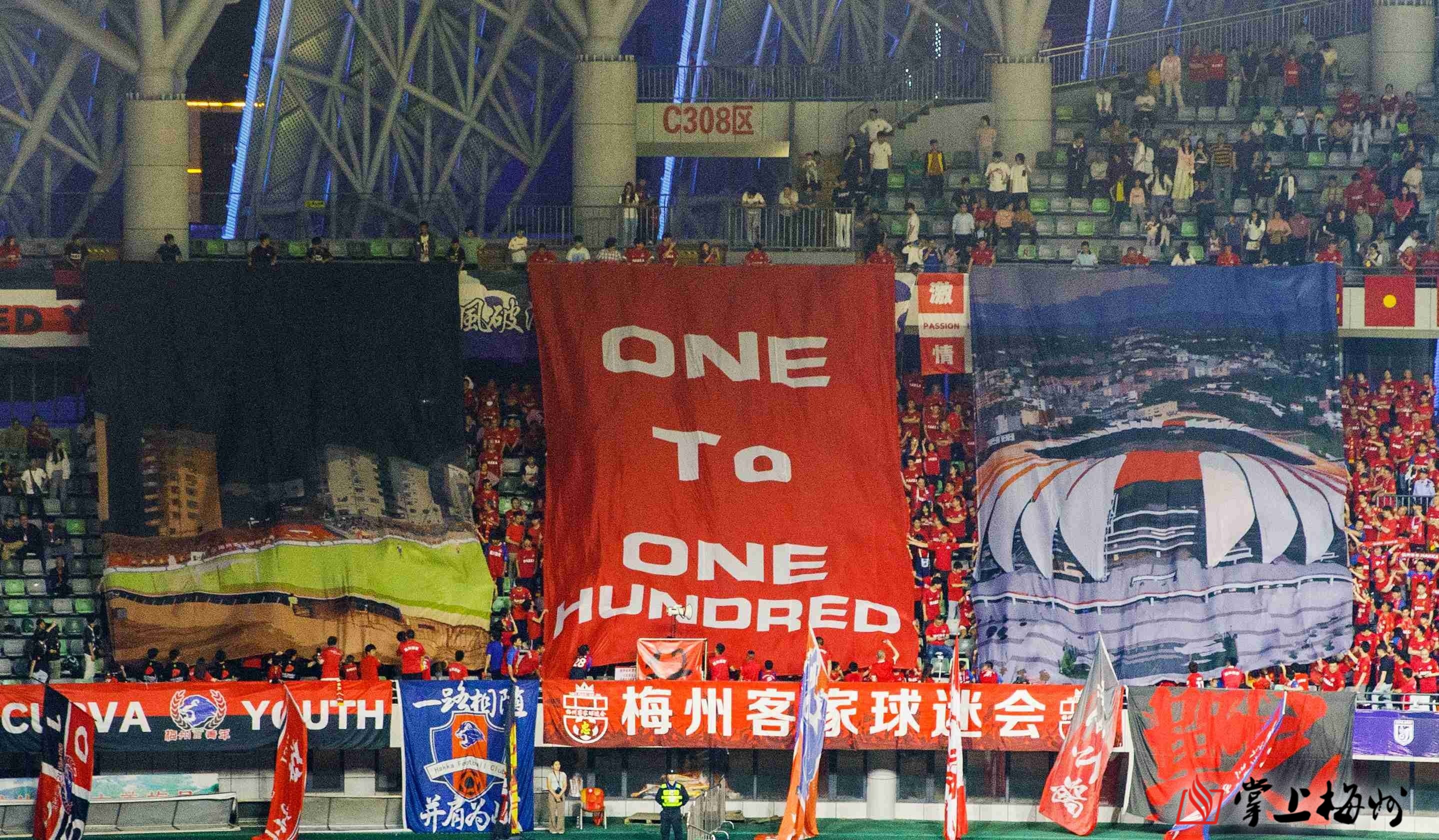 4月11日,中超联赛第6轮,此役是梅州客家队史第100场中超联赛,球迷展示的巨型横幅描绘了球队从五华县体育场到惠堂体育场的一百场中超历程。