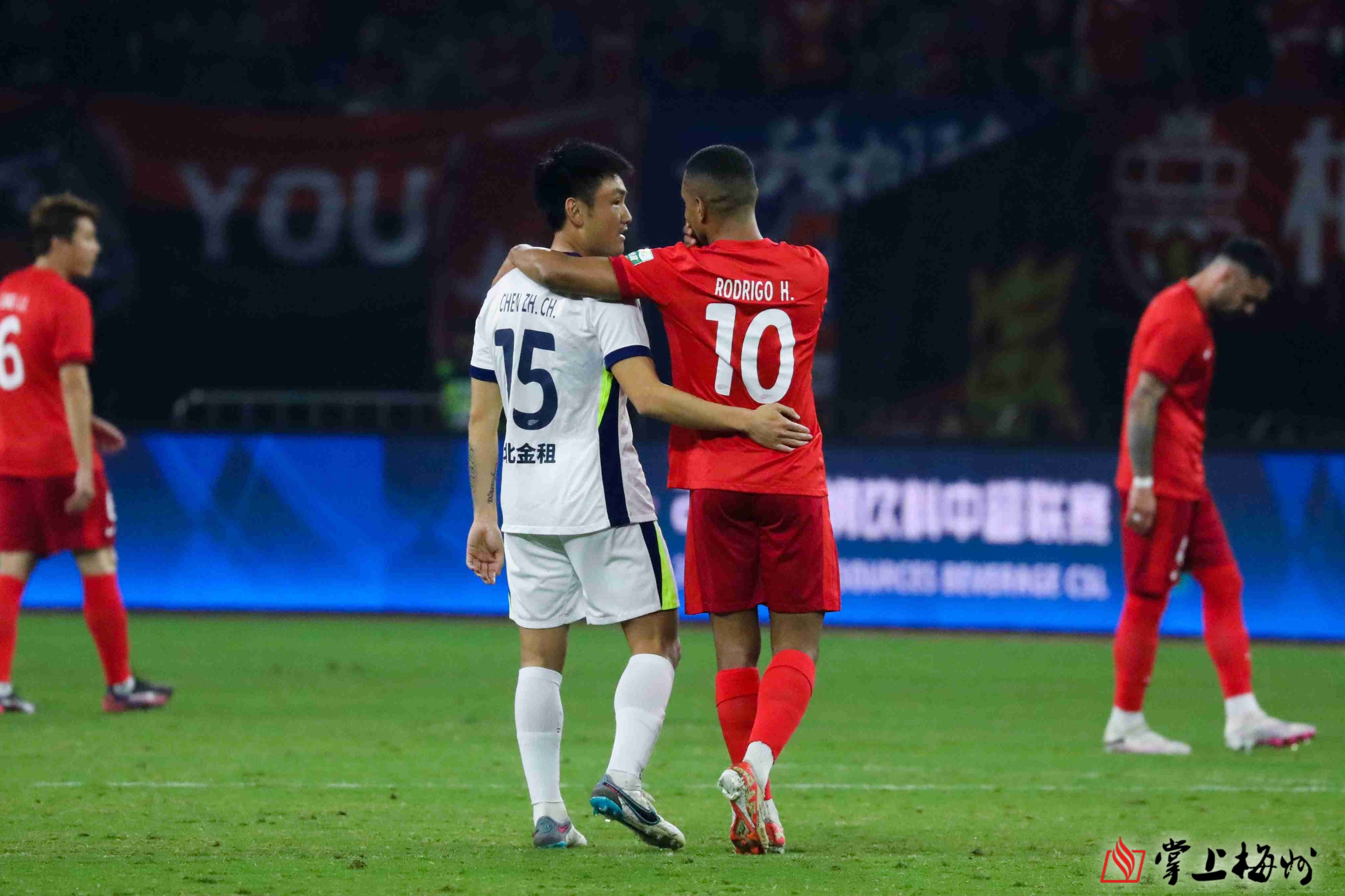4月6日,中超联赛第5轮,梅州客家在主场先丢一球的情况下,下半场连扳三球,以3比1战胜武汉三镇,迎来一场酣畅淋漓的大逆转。图为上赛季并肩作战的陈哲超和罗德里格(右),如今虽各为其主,两人仍亲密拥抱交谈。