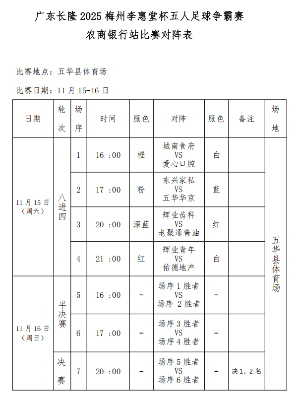 掌上梅州讯 广东长隆 2025 梅州李惠堂杯五人足球争霸赛农商银行站将于本周六即11月15日在五华县体育场开赛,比赛将持续两天进行。城南食府、爱心口腔、东兴家私、五华华京、辉业齿科、老聚通酱油、辉业青年、佑德地产8支球队将在2个比赛日里角逐本站冠军。