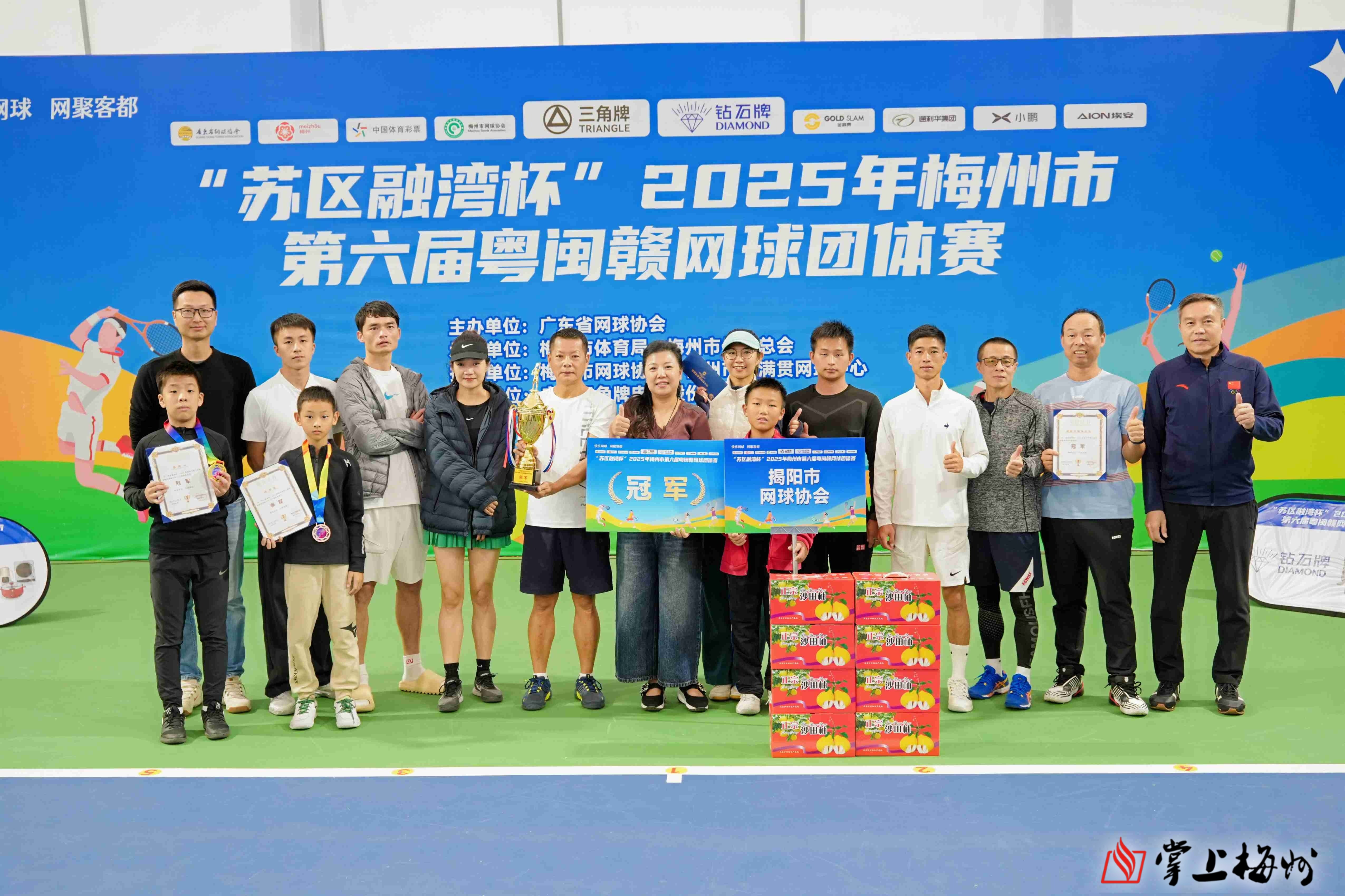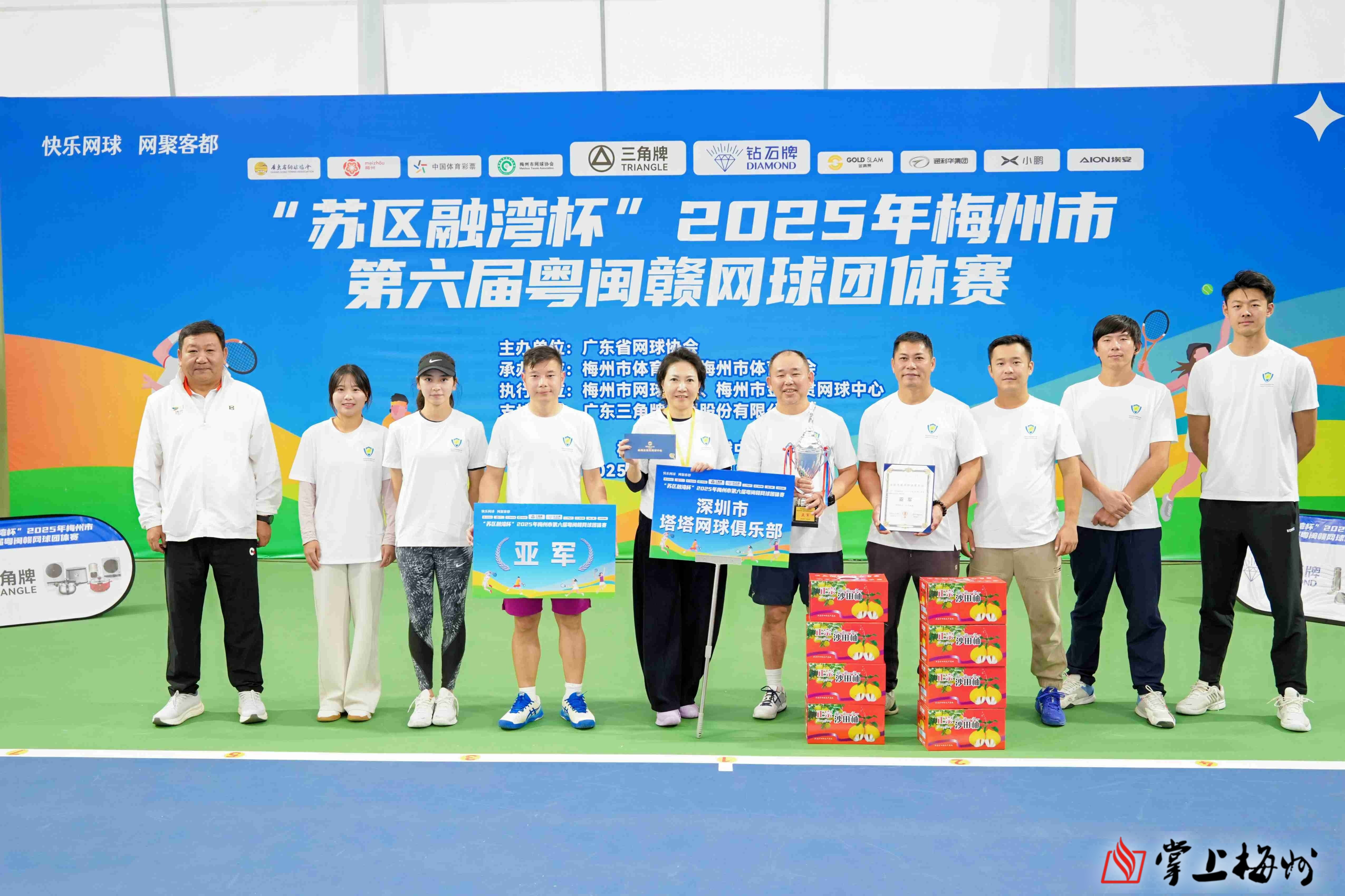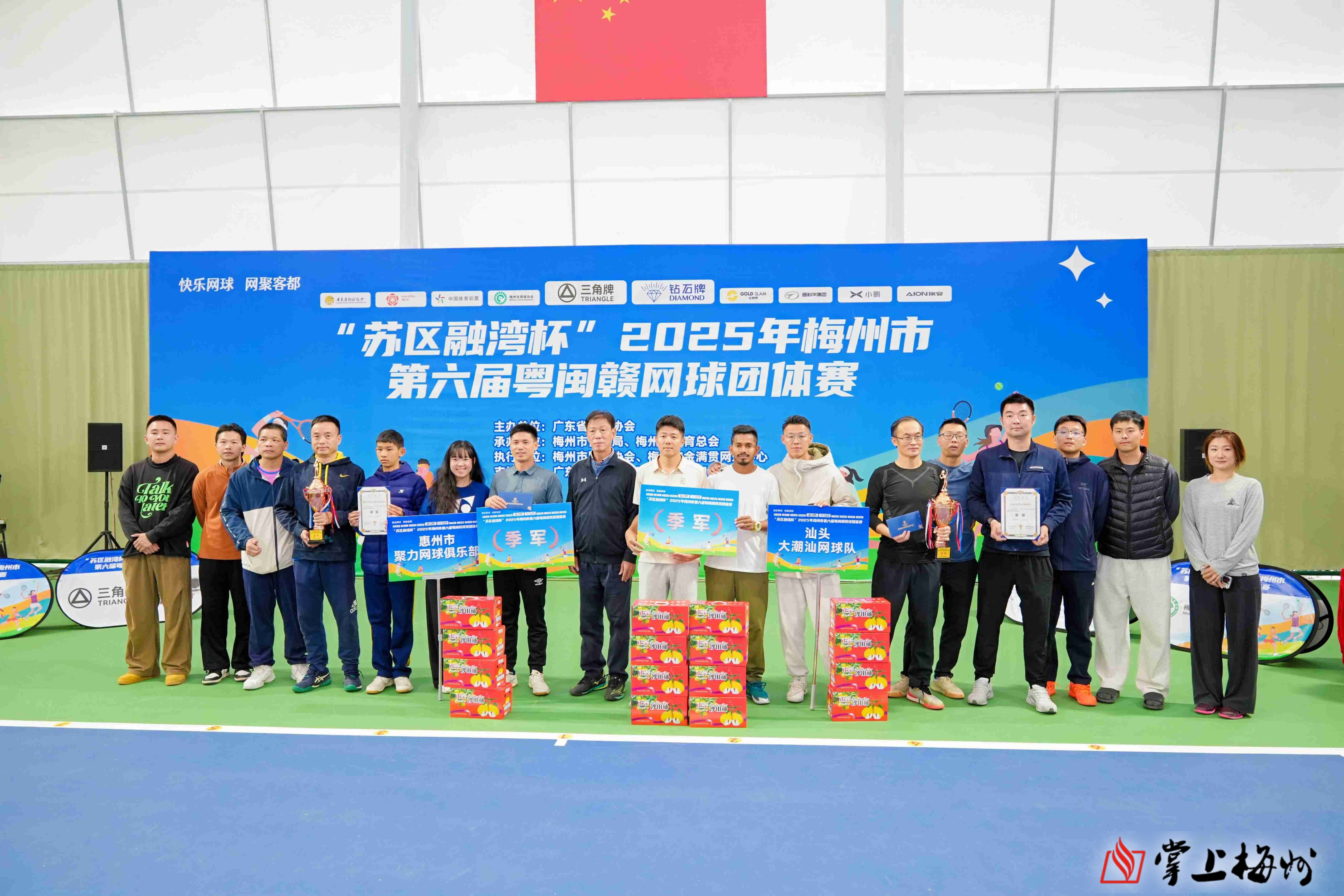 掌上梅州讯 11月30日,“苏区融湾杯”2025年梅州市第六届粤闽赣网球团体赛在梅州市金满贯网球中心落下帷幕。中国网球协会副主席、广东省网球协会主席麦良,梅州市人民政府副市长代伟,梅州市体育局局长、市体育总会会长陈远洋,广东省网球协会副主席朱修政,梅州市网球协会荣誉会长叶红星,梅州市网球协会会长刘文生等领导出席闭幕仪式。