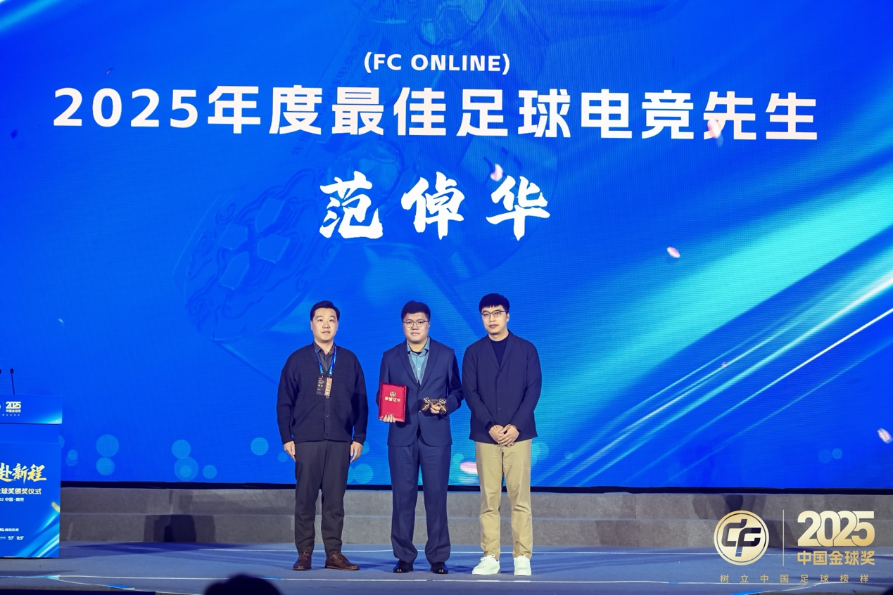 传统足球类奖项之外,2025中国金球奖组委会继续与腾讯互娱合作,连续第九年颁出足球电竞奖项。在过去一年快速进阶的郑州ADJ获得2025年度最佳足球电竞俱乐部,范倬华从一众强手中脱颖而出,获得2025《FC Online》年度最佳足球电竞先生的奖杯,近三年内第二次折桂的杨自初,则当选为《FC足球世界》年度最佳足球电竞先生。