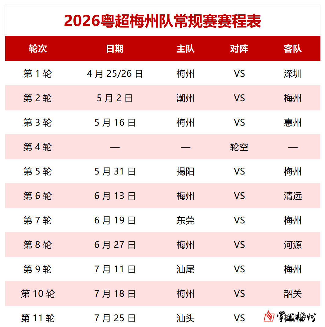 掌上梅州讯 2026年广东省城市足球超级联赛(以下简称“粤超”)将于4月25日、26日打响!目前,常规赛初始赛程表公布,官方购票渠道已上线。