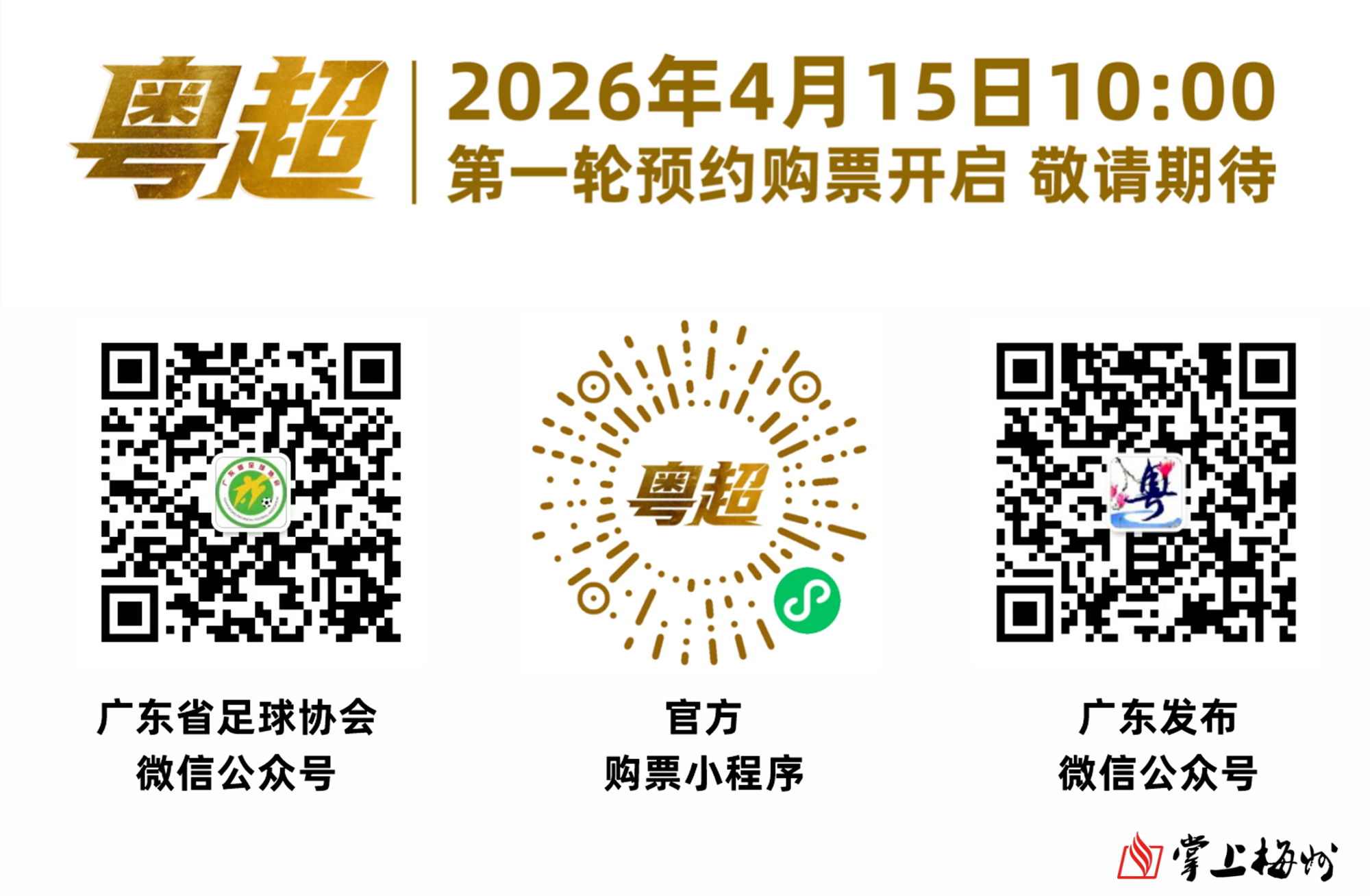 记者从赛事组委会获悉,为了让更多市民走进球场、感受足球魅力,“粤超”常规赛统一票价为8.8元。官方购票小程序“2026年广东省城市足球超级联赛”已正式上线,首轮预约购票将于4月15日10时起全面开放,球迷扫码关注“广东省足球协会”“广东发布”公众号和官方购票小程序可进行预约购票。需要提醒球迷的是,购票实行实名注册,一人一票,凭票入场,严禁倒卖、转赠,请广大球迷自觉维护公平购票秩序。