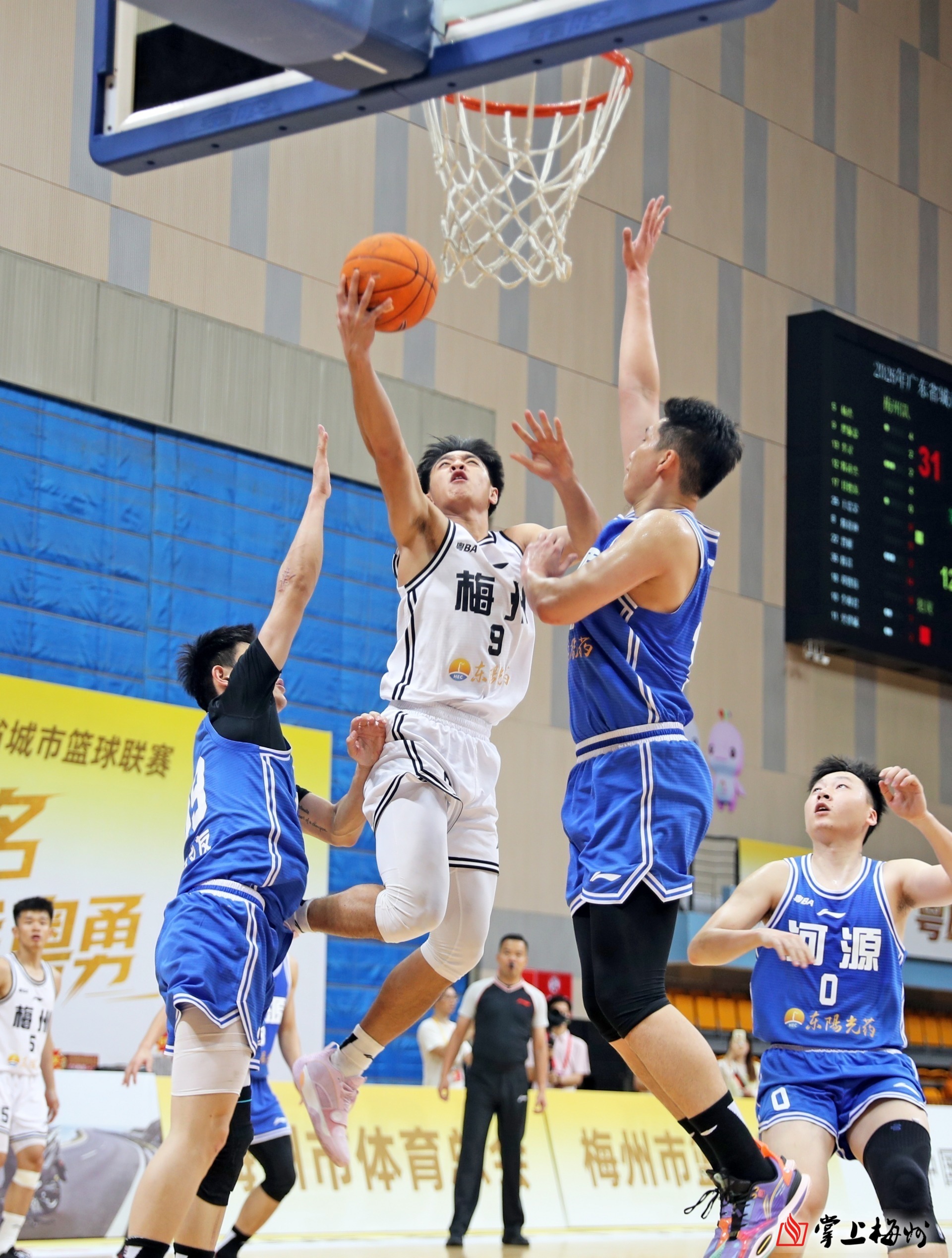 梅州队球员突破防守上篮得分。(高讯 摄)