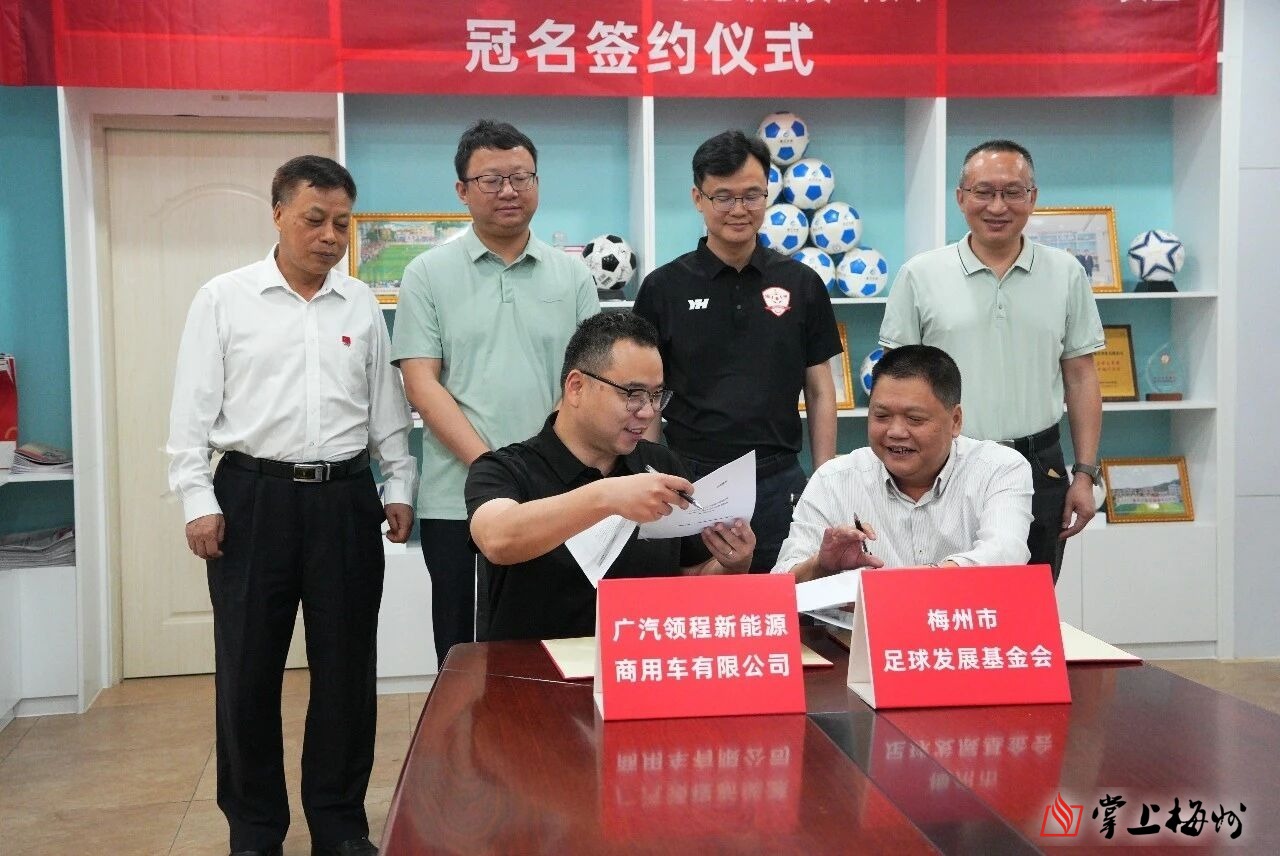 最后,由广汽领程市场总监吕志威、梅州市足球发展基金会理事长廖焕雄代表甲乙双方在《赛事赞助协议书》上签字并合影留念。