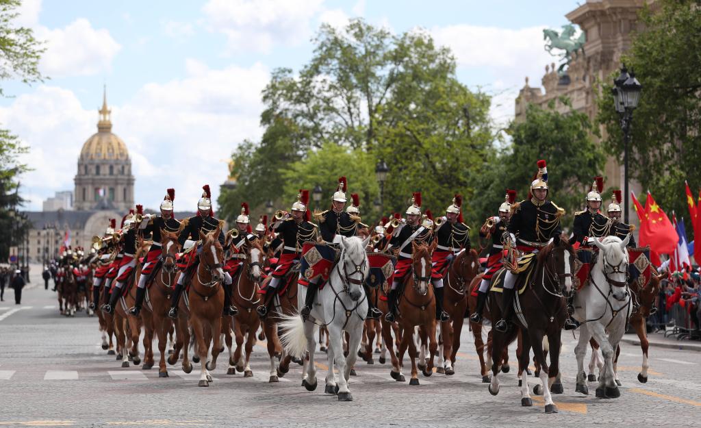 五月的巴黎,风和景明。塞纳河畔,荣军院金色穹顶熠熠生辉,五星红旗和蓝白红三色旗迎风飘扬。
