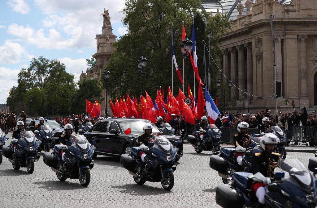 欢迎仪式后,习近平和夫人彭丽媛在共和国卫队148名骑兵组成的礼兵马队和摩托车队护卫下,乘车前往爱丽舍宫。