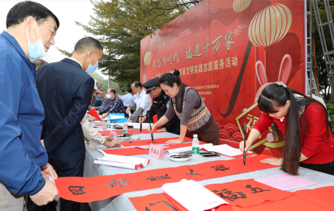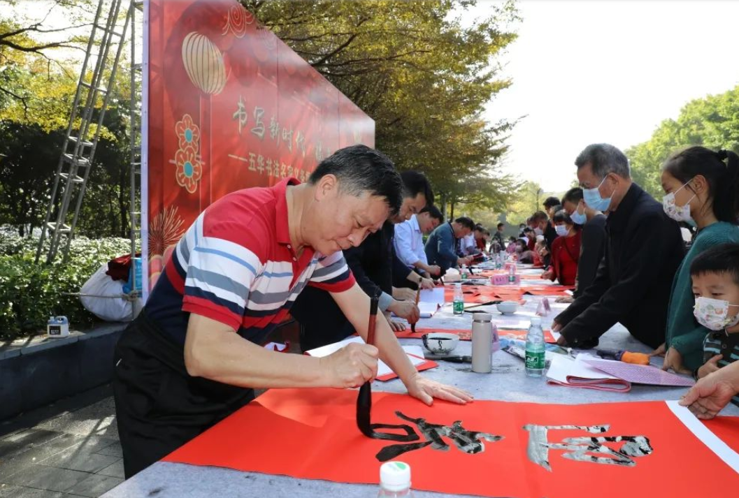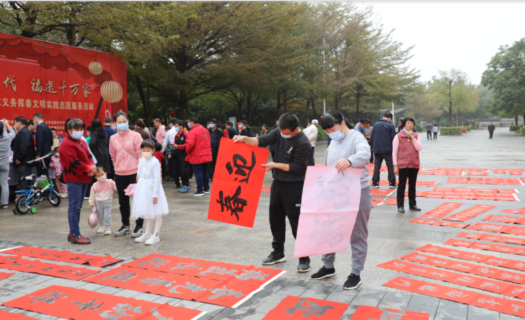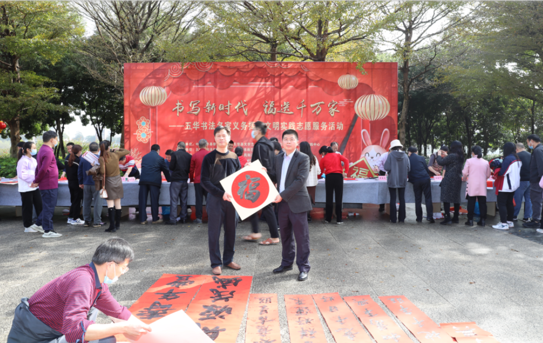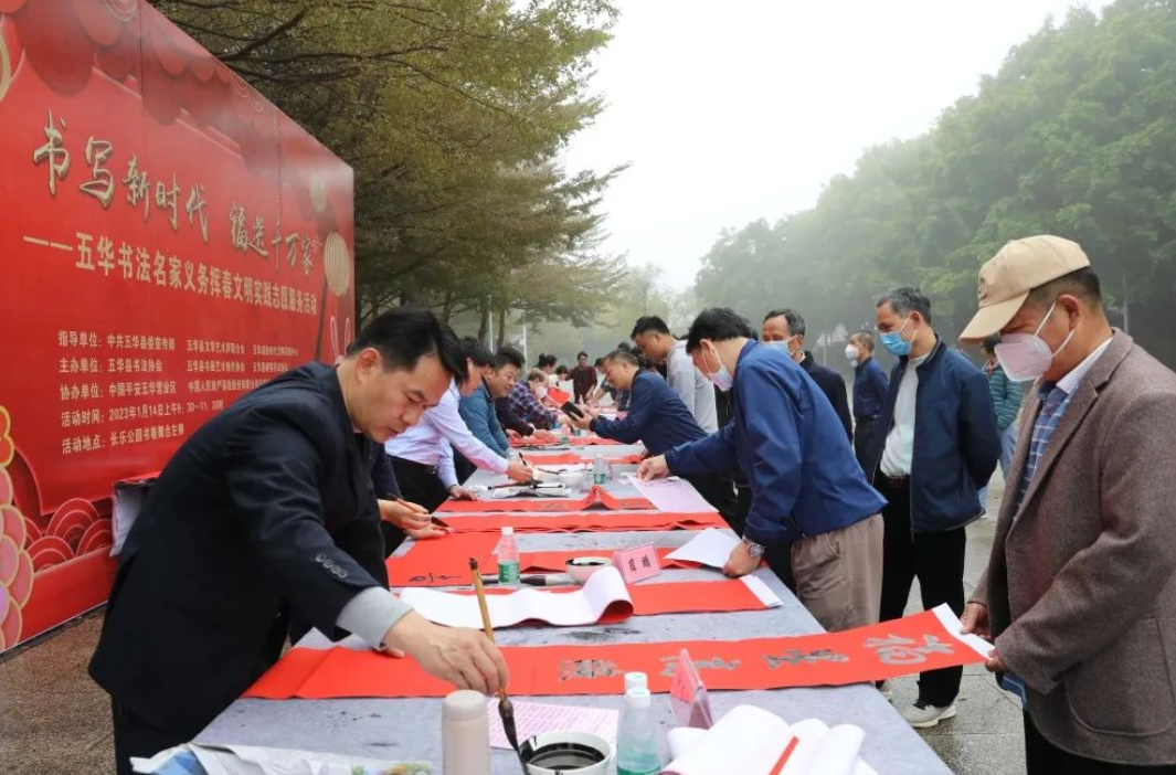 1月14日,以“书写新时代、福送千万家”为主题的五华书法名家义务挥春文明实践志愿服务活动在长乐公园书卷舞台开展,该活动由中共五华县委宣传部、五华县文学艺术界联合会、五华县新时代文明实践中心指导,县书法家协会、县书画艺术创作协会、县硬笔书法协会主办。