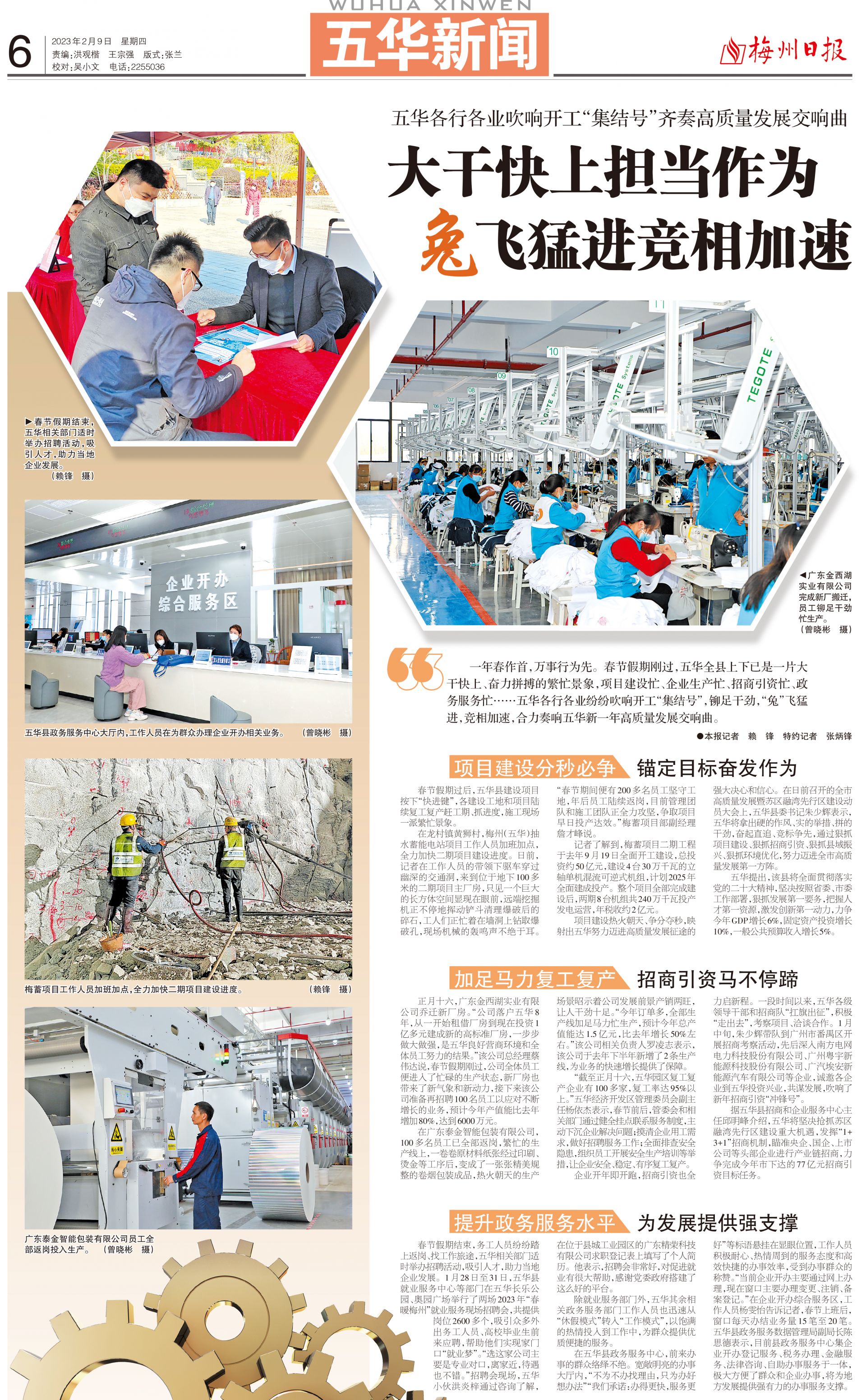 一年春作首,万事行为先。春节假期刚过,五华全县上下已是一片大干快上、奋力拼搏的繁忙景象,项目建设忙、企业生产忙、招商引资忙、政务服务忙……五华各行各业纷纷吹响开工“集结号”,铆足干劲,“兔”飞猛进,竞相加速,合力奏响五华新一年高质量发展交响曲。