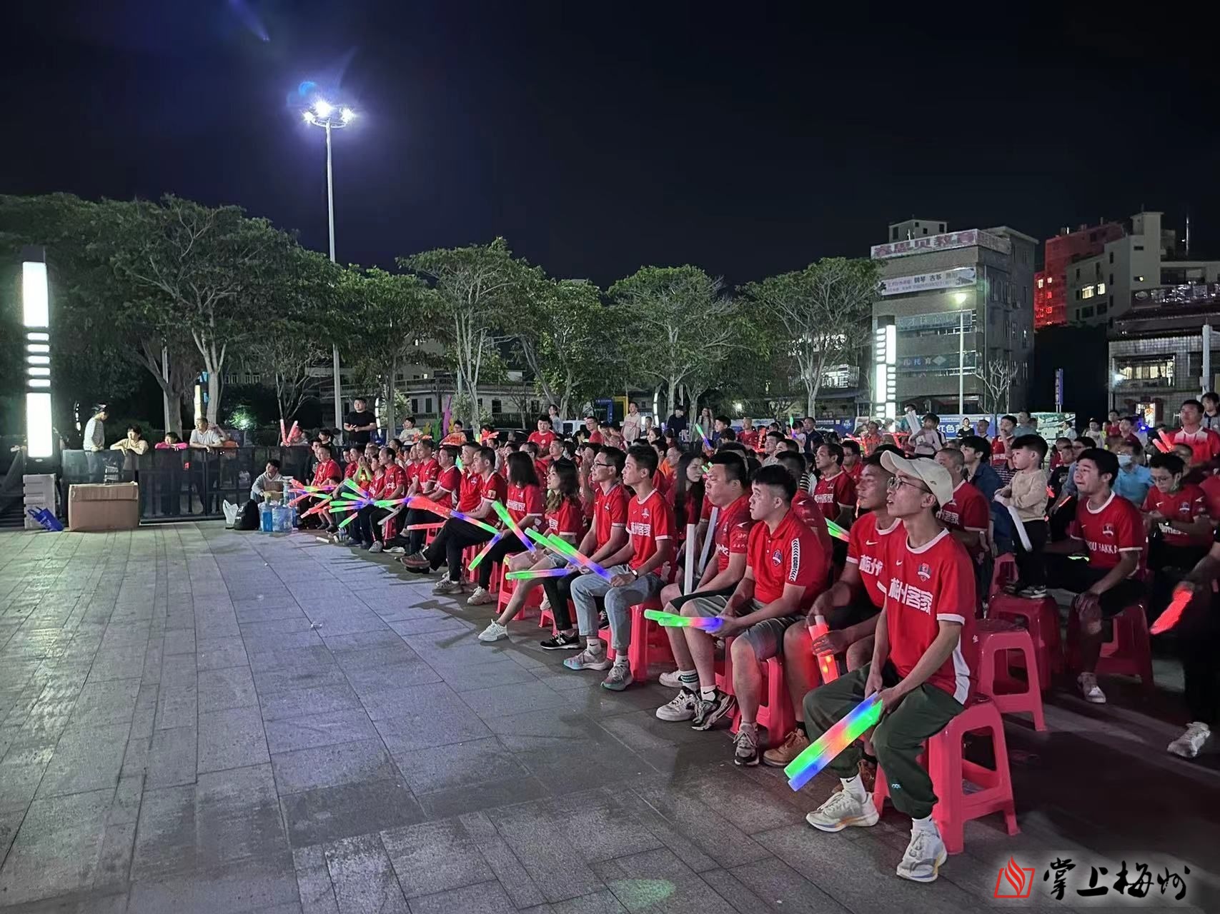 掌上梅州讯 4月15日,2023中超联赛在万众期待中拉开了战幕,掀起了球迷看球的热潮。当晚,北京国安队对阵梅州客家队赛前,梅州客家队主场惠堂体育场门前增设了巨型屏幕,吸引了300多名球迷前来看球,为梅州客家队“远征”北京加油助威。