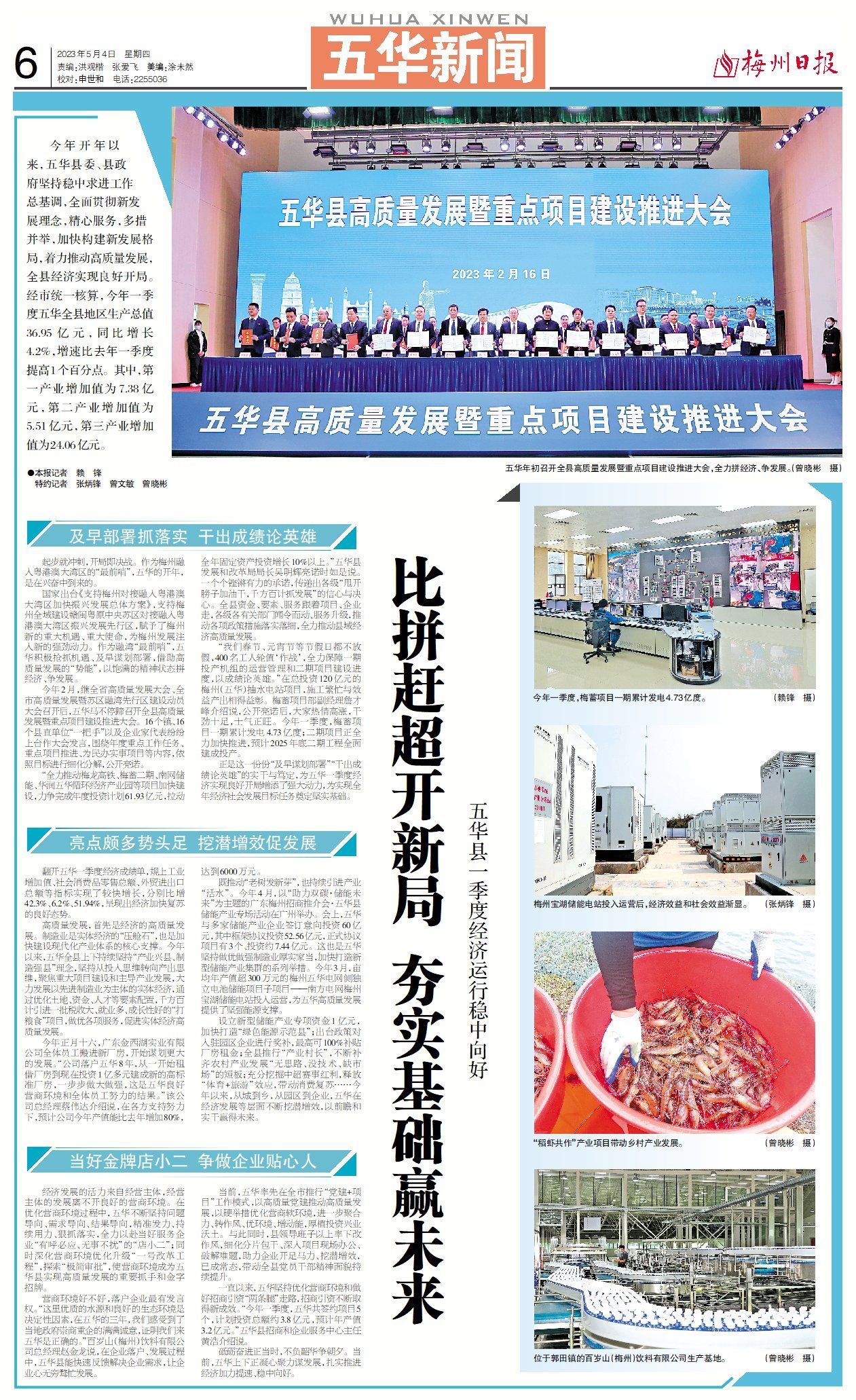 “全力推动梅龙高铁、梅蓄二期、南网储能、华润五华循环经济产业园等项目加快建设,力争完成年度投资计划61.93亿元,拉动全年固定资产投资增长10%以上。”五华县发展和改革局局长吴明辉亮诺时如是说。一个个铿锵有力的承诺,传递出各级“甩开膀子加油干,千方百计抓发展”的信心与决心。全县资金、要素、服务跟着项目、企业走,各级各有关部门闻令而动、服务升级,推动各项政策措施落实落细,全力推动县域经济高质量发展。