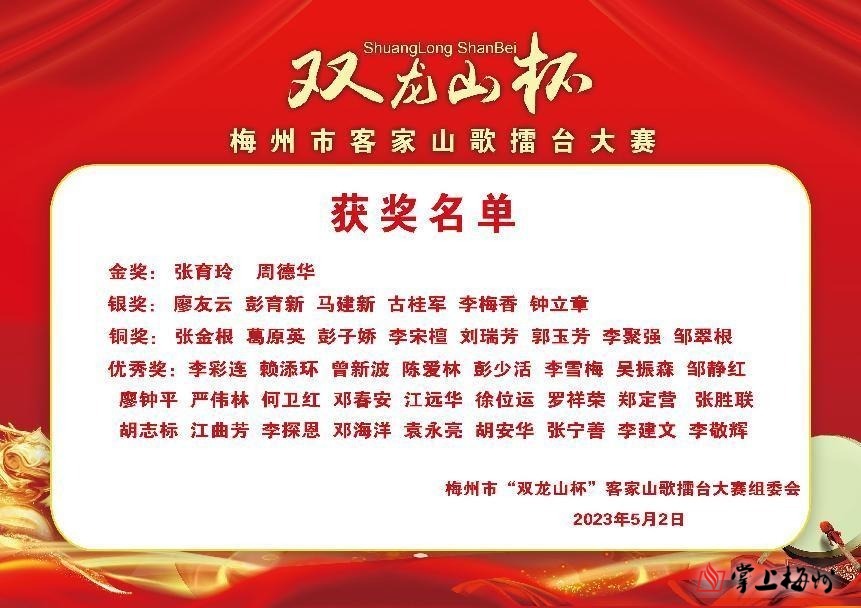 据了解,此次大赛由梅州市文化馆、梅州市非物质文化遗产保护中心、五华县文学艺术界联合会、五华县横陂镇人民政府、五华县文化馆指导,梅州市客家山歌协会、梅州市五华县双龙山旅游发展有限公司主办,深圳市琴江梅子文化传播有限公司承办,深圳市南方采茶戏曲艺术中心、五华县双龙山客家山歌队协办。