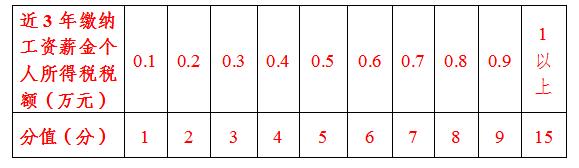 企业或个体工商户近3年生产经营累计纳税额或个人近3年缴纳工资薪金个人所得税税额情况,按上述规定计算积分。需提供营业执照、近3年的纳税税票或税务部门出具的纳税证明,税额可累计。申请人同时缴纳生产经营纳税或工资薪金个人所得税的,可以累计积分,总分不超过15分。