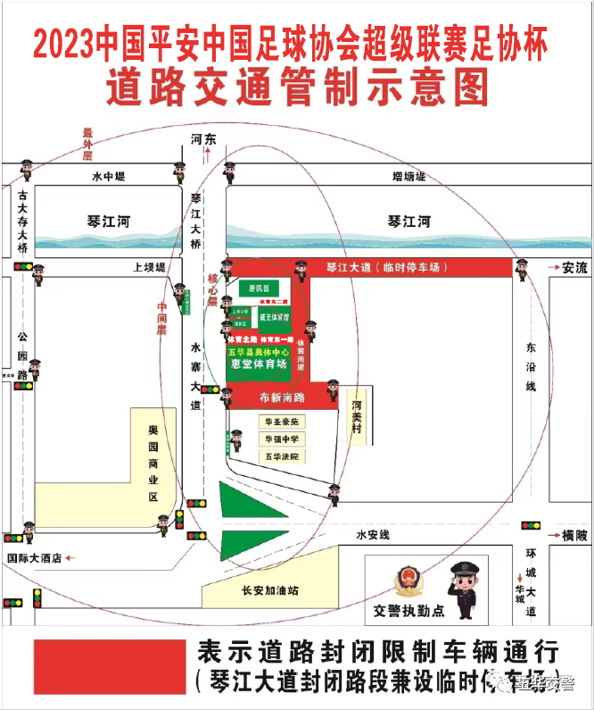 2023年5月20日晚上,在五华县水寨镇五华奥林匹克体育中心举行2023中国平安中国足球协会超级联赛梅州(五华)赛区比赛,为确保赛事期间环奥林匹克体育中心周边道路安全畅通有序,五华县公安局交警大队根据《中华人民共和国道路交通安全法》第三十九条规定,届时将对环奥林匹克体育中心周边道路进行交通管制。请广大市民给予理解和支持,服从交通民警和工作人员指挥,并提前做好绕行线路及乘坐公交车或徒步前来观看赛事的计划安排,以免影响出行。现将有关事项通告如下: