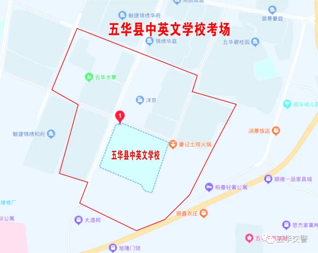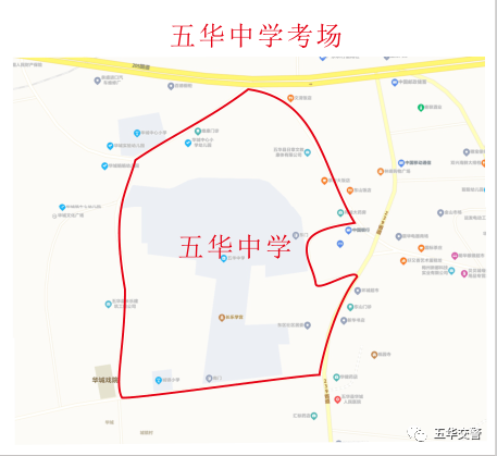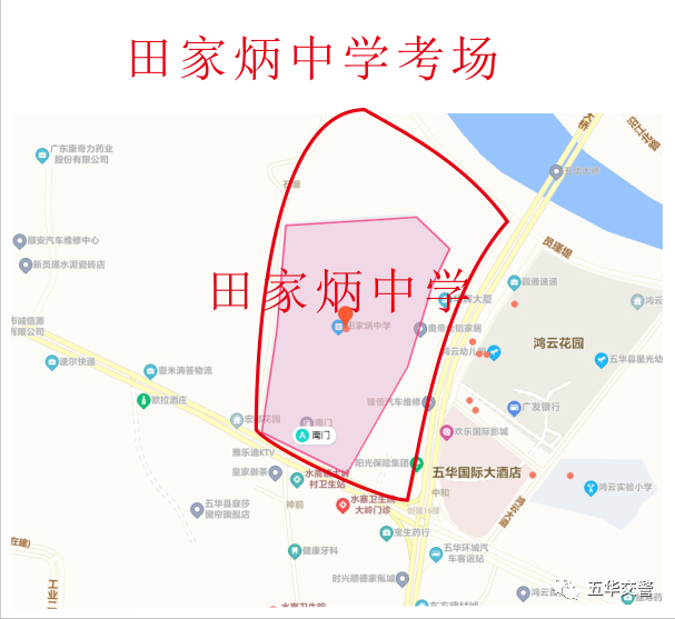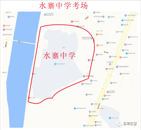 ▲五华县水寨中学考场周边红色路段为禁鸣区域,水中堤为临时交通管制路段▲