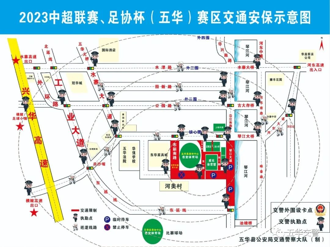 2023年6月9日晚上,在五华县水寨镇五华奥林匹克体育中心举行2023中国平安中国足球协会超级联赛梅州(五华)赛区比赛,为确保赛事期间环奥林匹克体育中心周边道路安全畅通有序,五华县公安局交警大队根据《中华人民共和国道路交通安全法》第三十九条规定,届时将对环奥林匹克体育中心周边道路进行交通管制。请广大市民给予理解和支持,服从交通民警和工作人员指挥,并提前做好绕行线路及乘坐公交车或徒步前来观看赛事的计划安排,以免影响出行。现将有关事项通告如下: