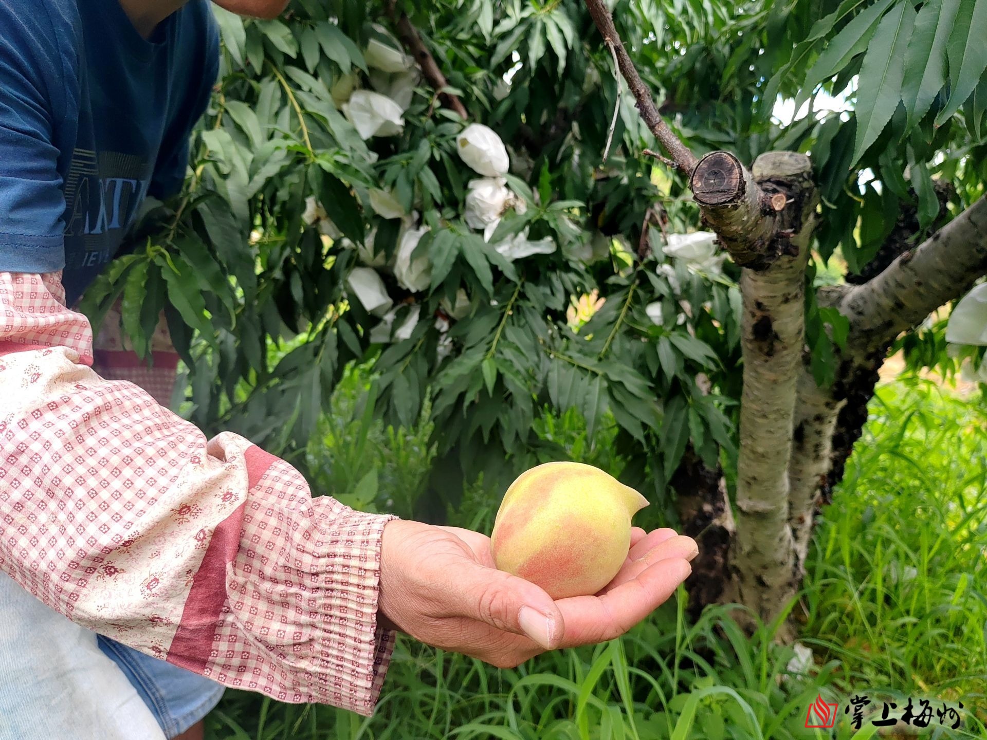走进金石村鹰嘴桃基地,只见一个个袋装的鹰嘴桃沉甸甸地挂满枝头,打开袋子,记者看到,硕大饱满的果实粉白相间,隐约可闻到弥漫在空气中的香甜气息,令人食指大动。
