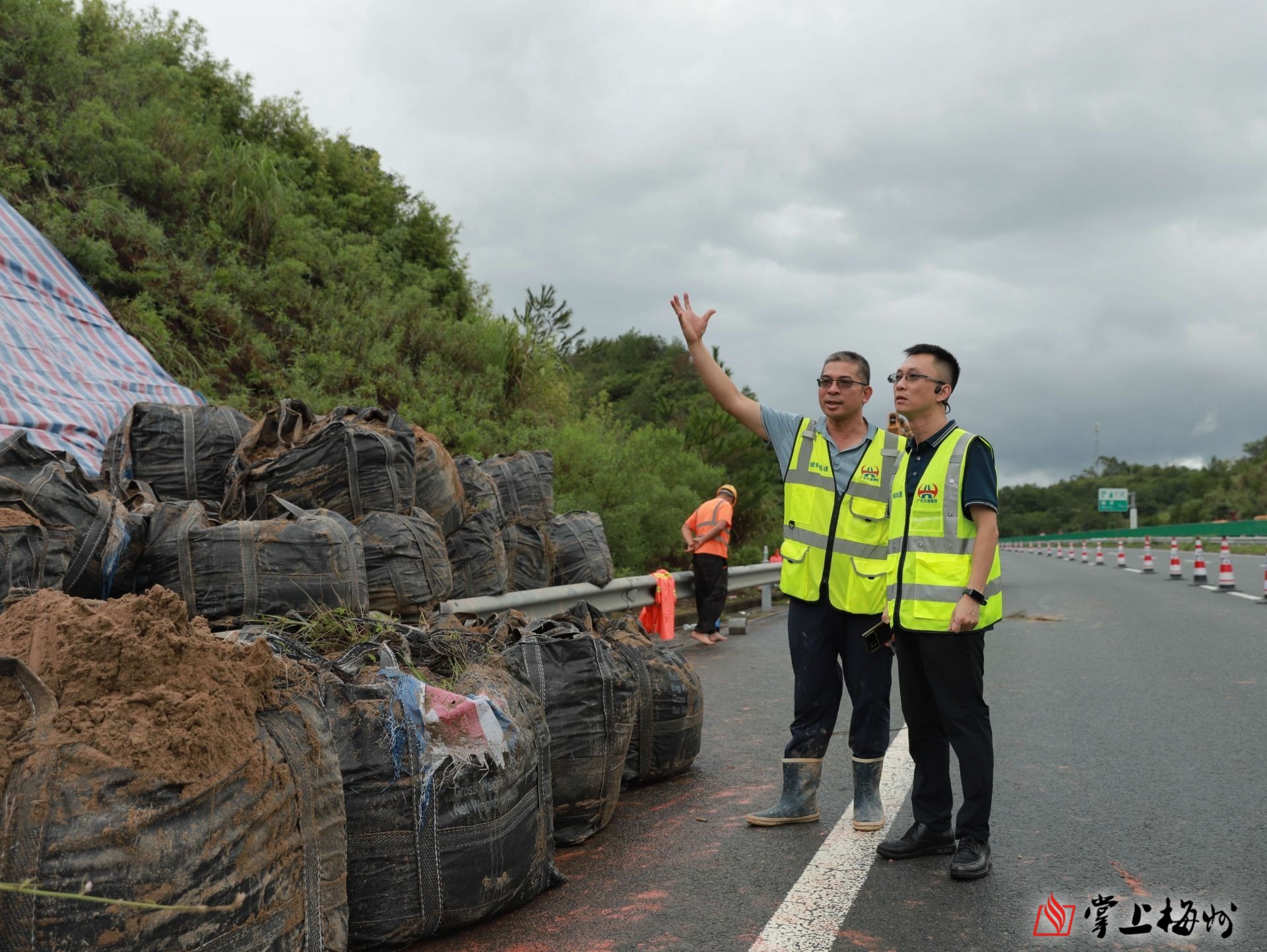 险情发生后,揭博高速立即启动应急预案,组织党员、业务骨干成立“应急抢险”队伍,第一时间赶赴现场开展应急处置,对溜方边坡周边进行勘察研判。同时在该路段设置安全警示标志,封闭第三车道及应急车道,提醒过往车辆安全通行。